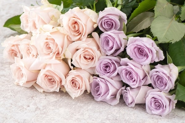 紫色の花をメインにした花束は、古希祝いらしさがありますね。