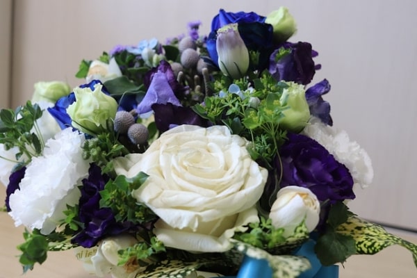 テーマカラーの青い花をメインにしたり、本人の好きな花を入れたり、自由にアレンジしましょう。