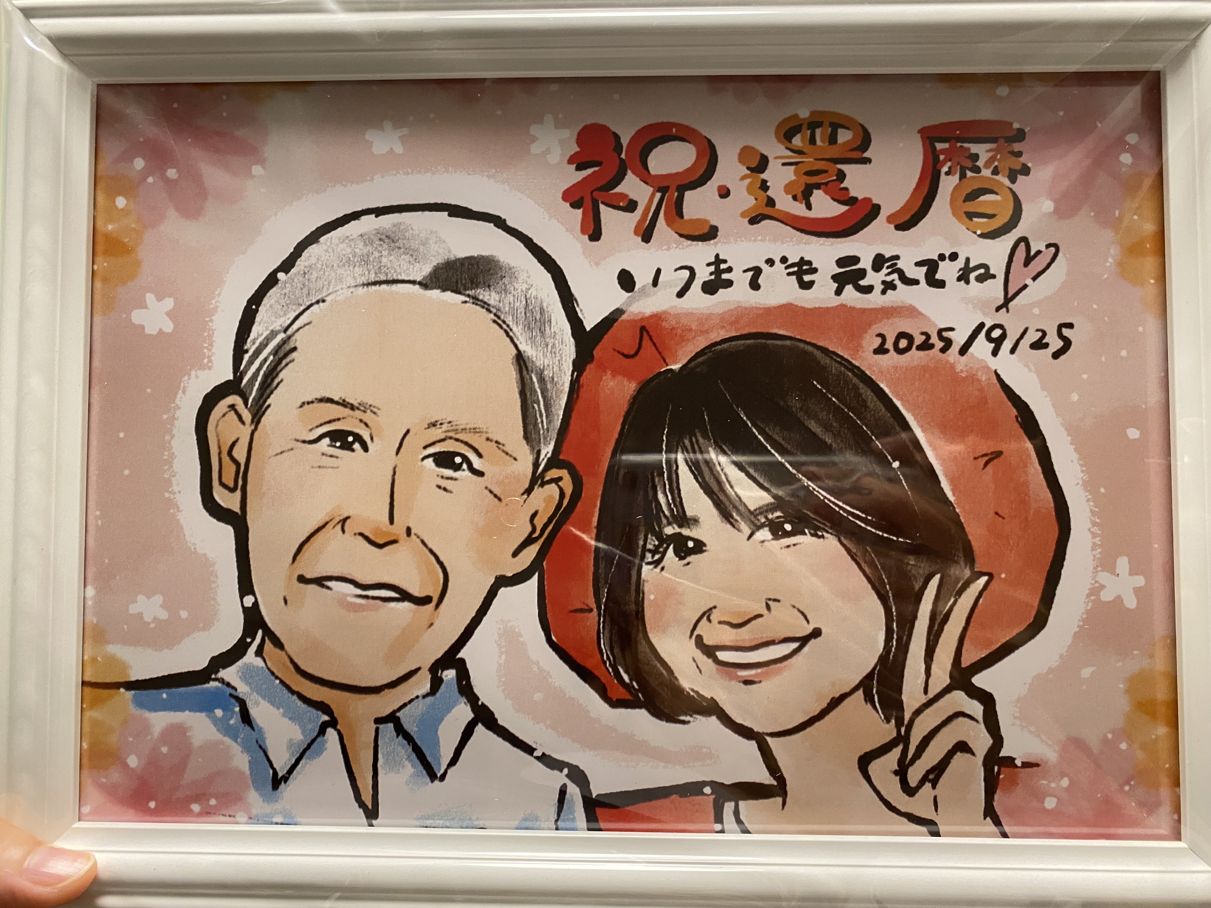 届いた似顔絵を見て想像以上で感激しました! 最初にお願いした絵師さんが体調不良という事で変更していただきました。メールでやり取りして対応していただきましがこんなに早く届くと思っていませんでした。これから米寿のお祝いで親戚で集まってプレゼントする予定です。祖父母も喜んでくれると思います。 ありがとうございました。