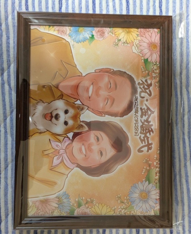 10月28日に金婚式を迎えるにあたり写真撮影だけでなく、東北旅行に行きましたが、何か物足りなく似顔絵もいいかなと思い申し込みました。 大変早々に描いて戴き、誠にありがとうございました。 出来ばえですが、確かに「やさしい笑顔で」とお願いしましたが、あまり似ていないと感じております。また、金婚式祝いとしてはちょっと若々しすぎのように思われます。