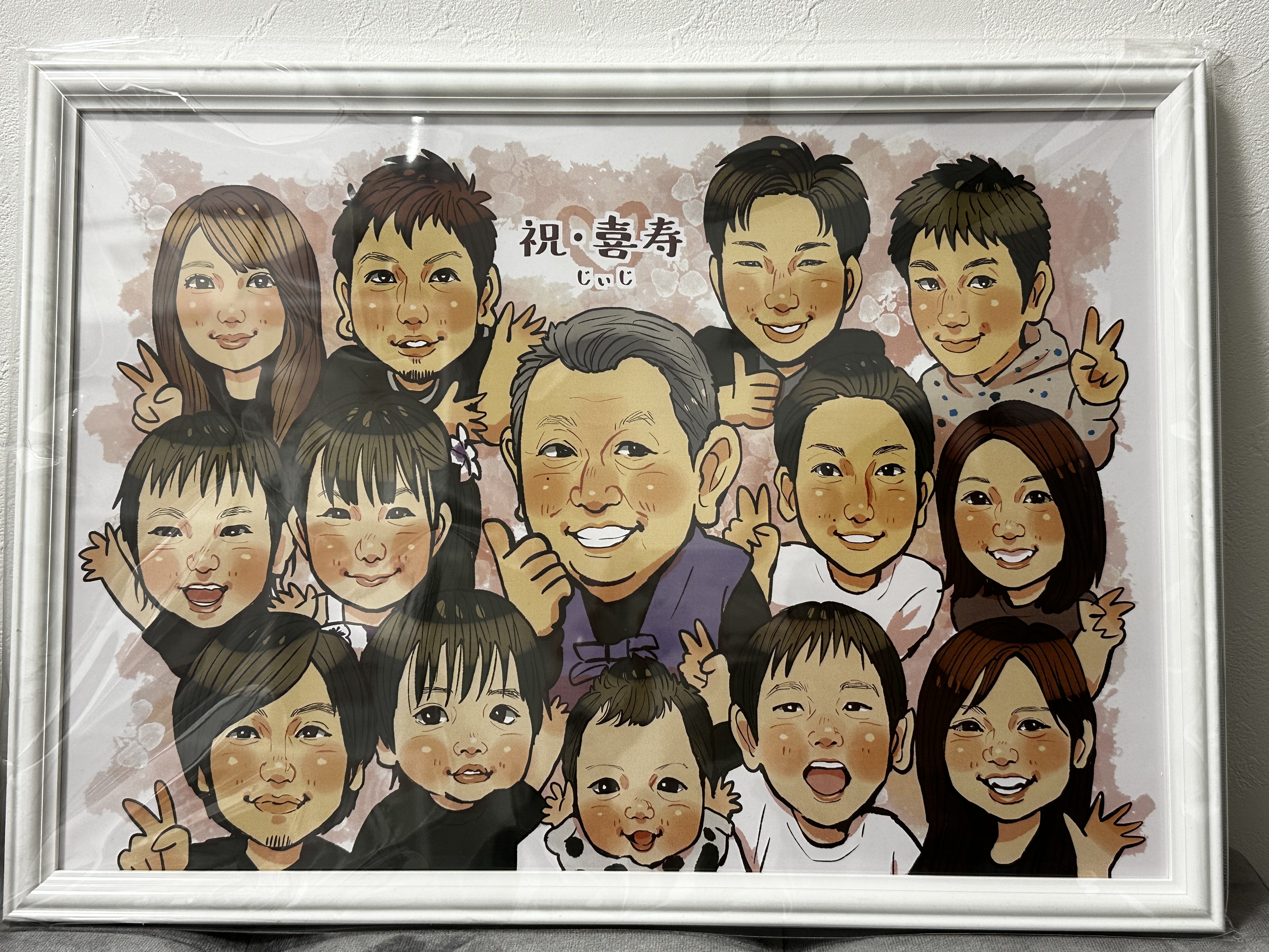 直近で日数がなかったのに迅速に対応して頂き、 そして何より希望通りの似顔絵が届きとても嬉しかったです。 喜寿を迎えた祖父も大喜びし、家族で似てるーーと盛り上がりました! ありがとうございました。大満足でした。 大人数の依頼、日数の少なさだったのに当日間に合って プレゼントできて良かったです! また利用させて頂きたいとおもっております。