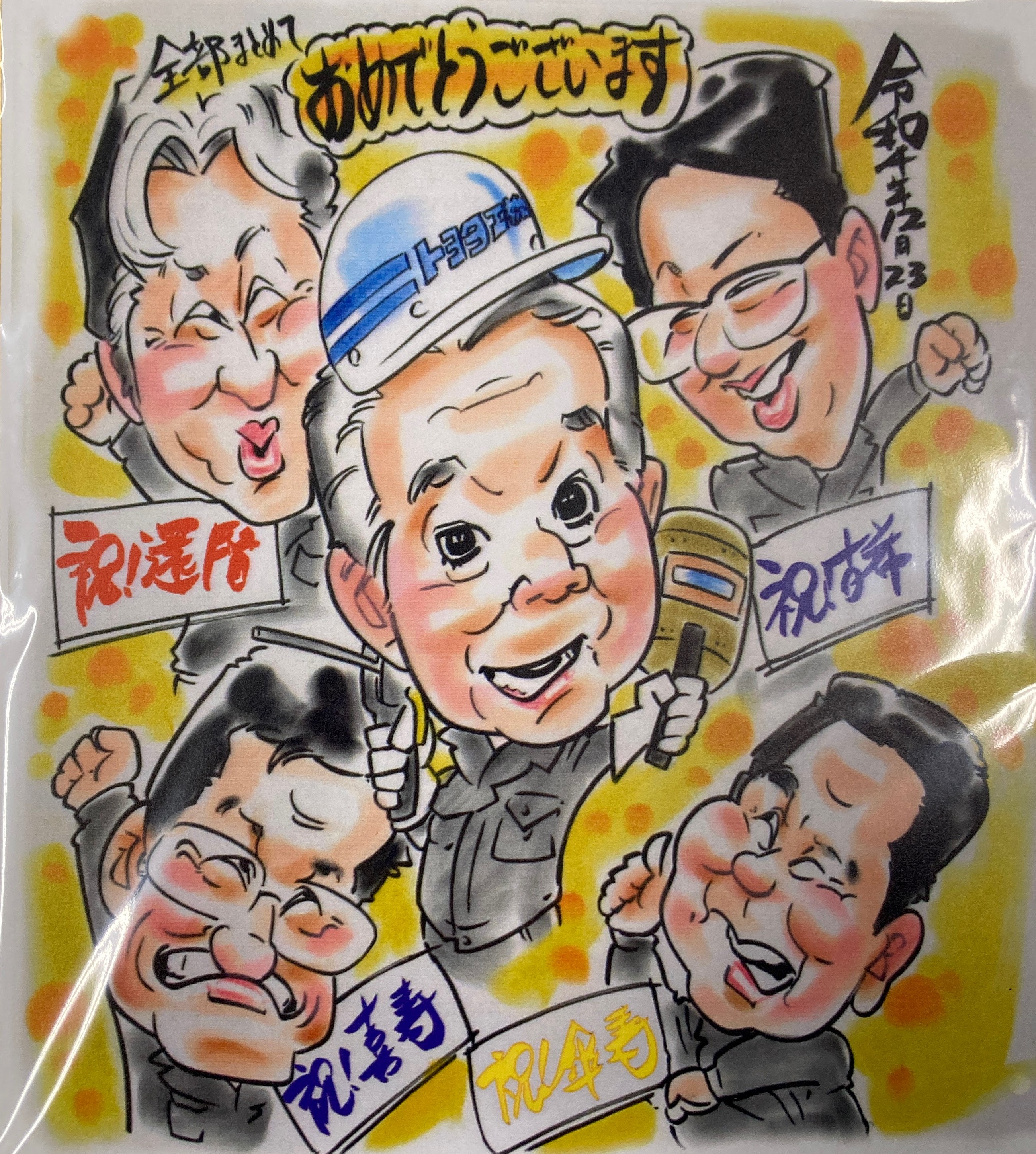 この度は大変お世話になりました 似顔絵手元に届き、確認なしでの一発勝負感があったため とても不安でいっぱいでしたが、開けてビックリの大満足の出来栄えに 皆感激しています。後日準備していたフレームに入れ贈呈となりますが 必ず喜んでくれると思います。とても楽しみです 宝物になると思います。 ご対応いただきました皆様、似顔絵を描いていただいたひでおさん 誠にありがとうございました