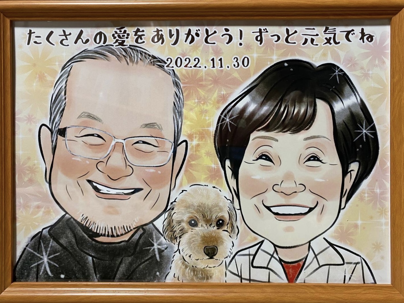 愛犬が亡くなってしまって悲しんでいる祖父母に愛犬との3ショットの似顔絵をプレゼントさせていただきました。2人とも笑顔で可愛く描いてくださってありがとうございます!祖父母はとっても喜んでくれて、宝物にすると言っていました!上月さんに頼んで良かったです!機会があればまたお願いしたいです!是非よろしくお願いします!本当にありがとうございました!