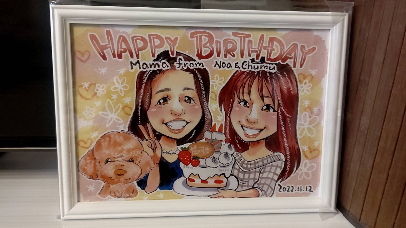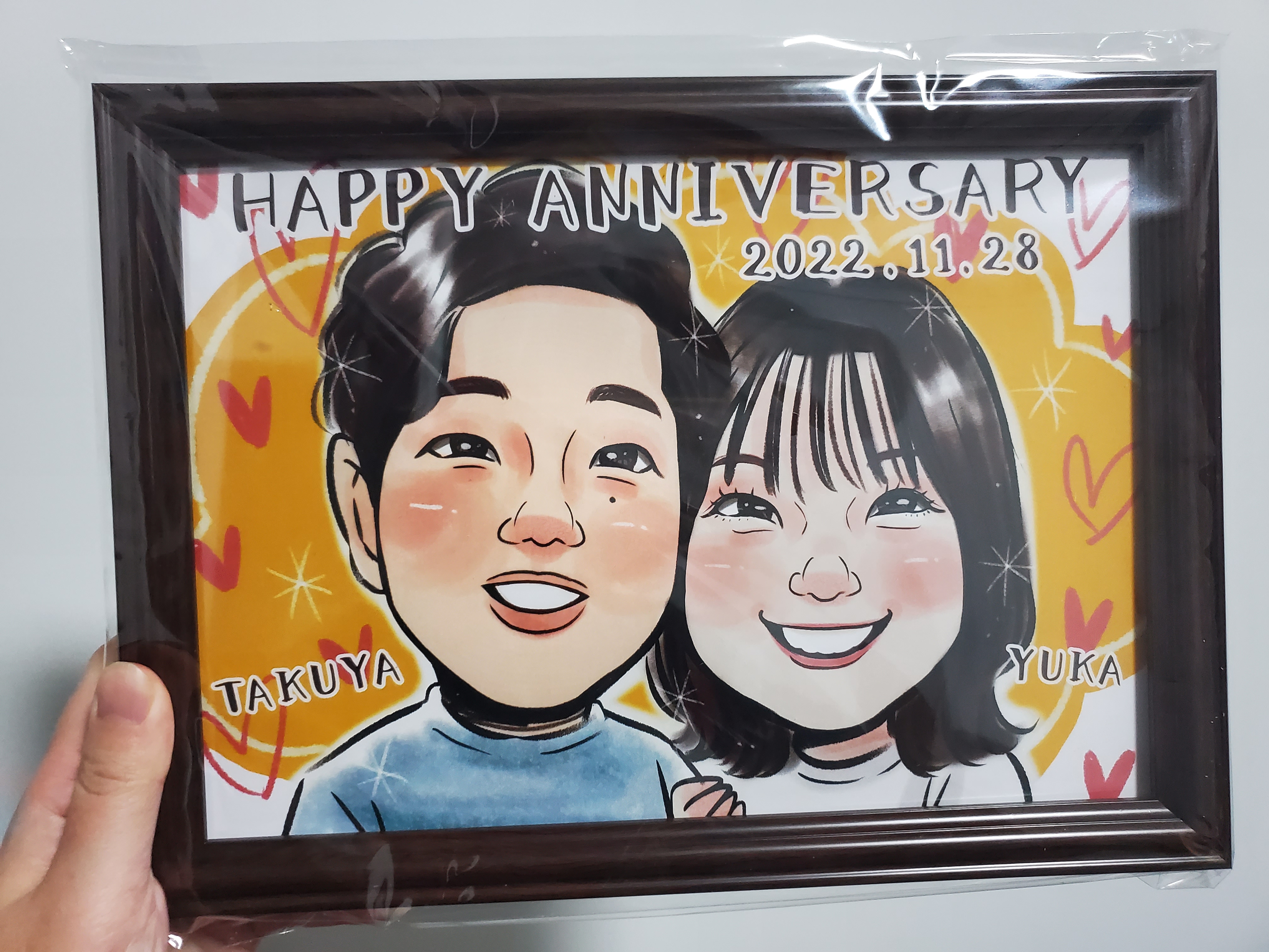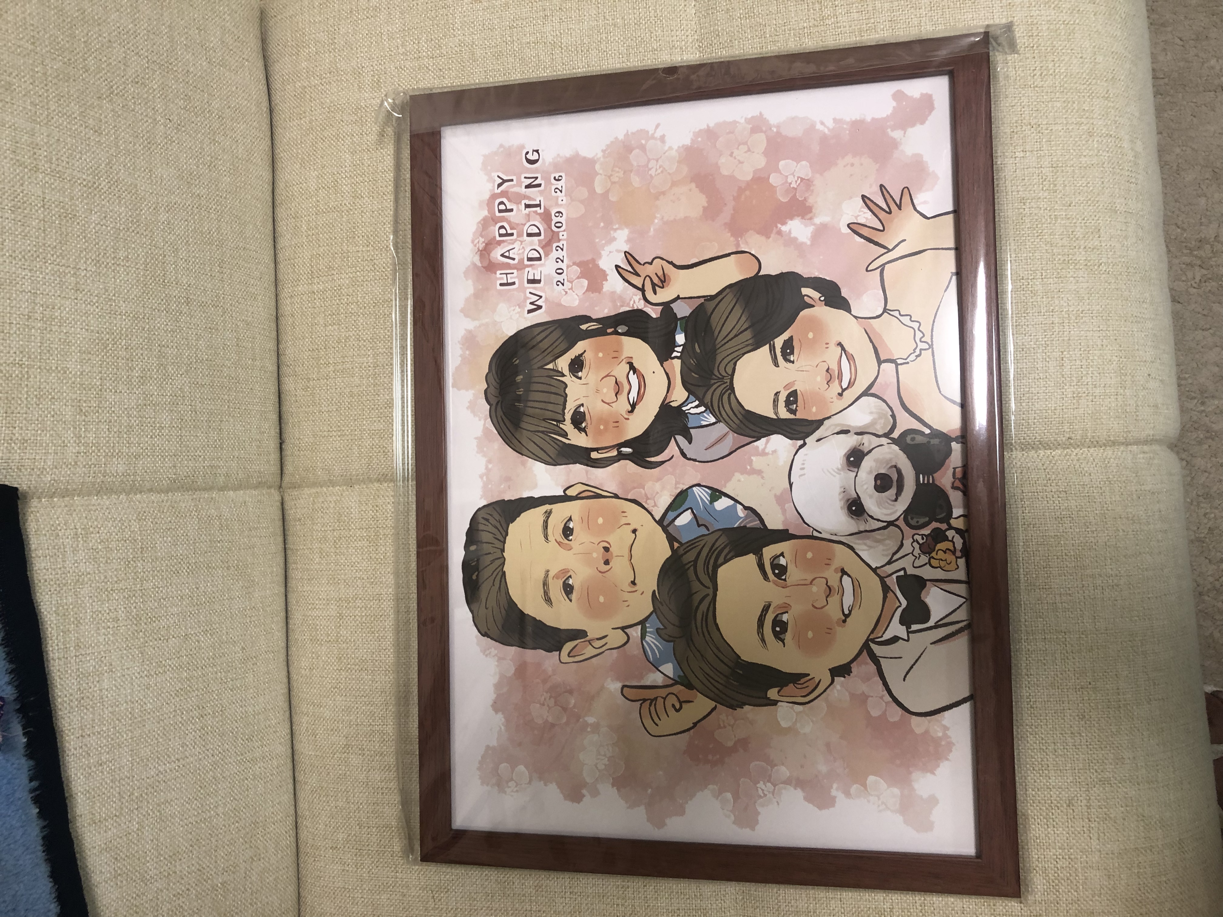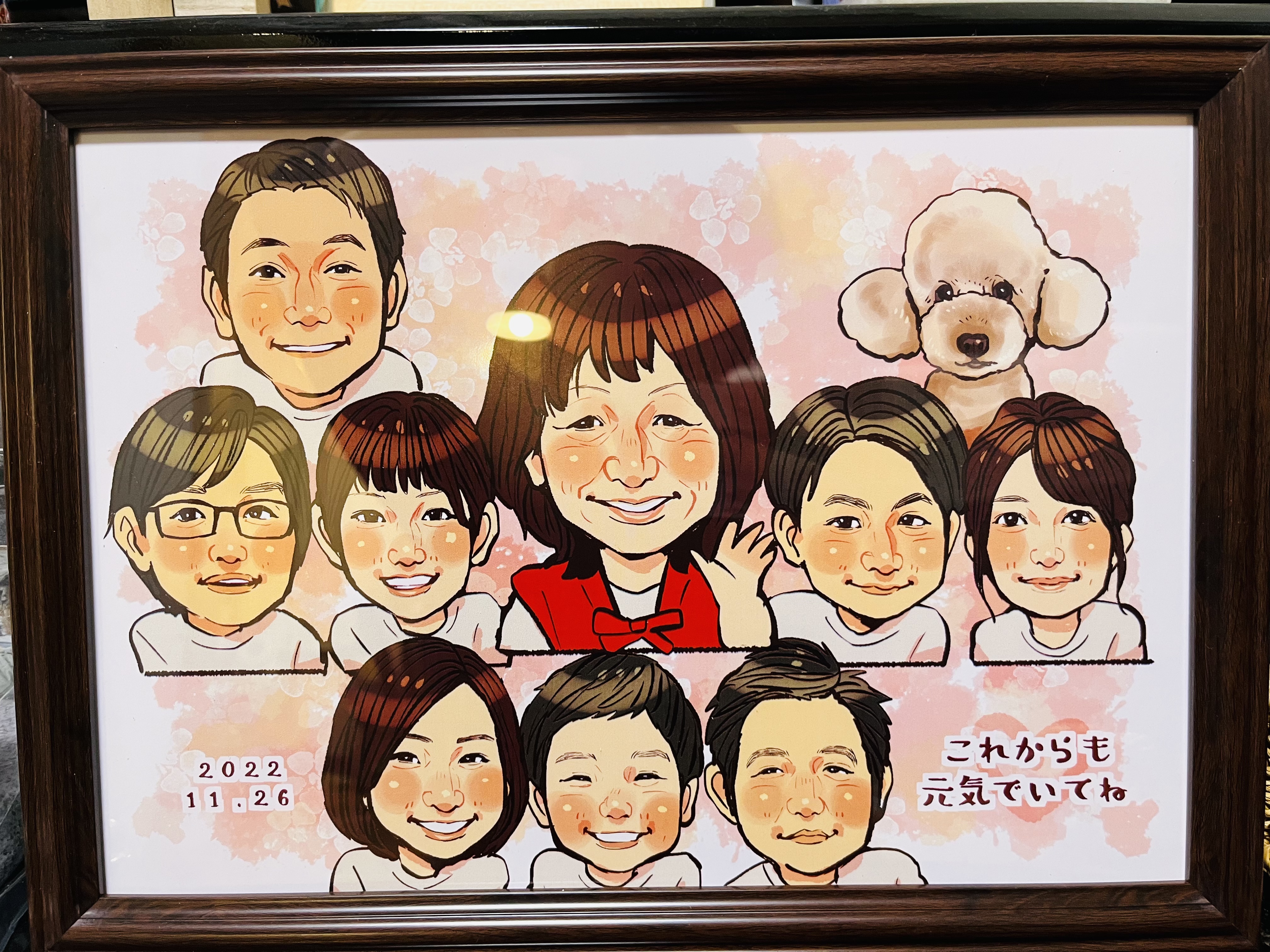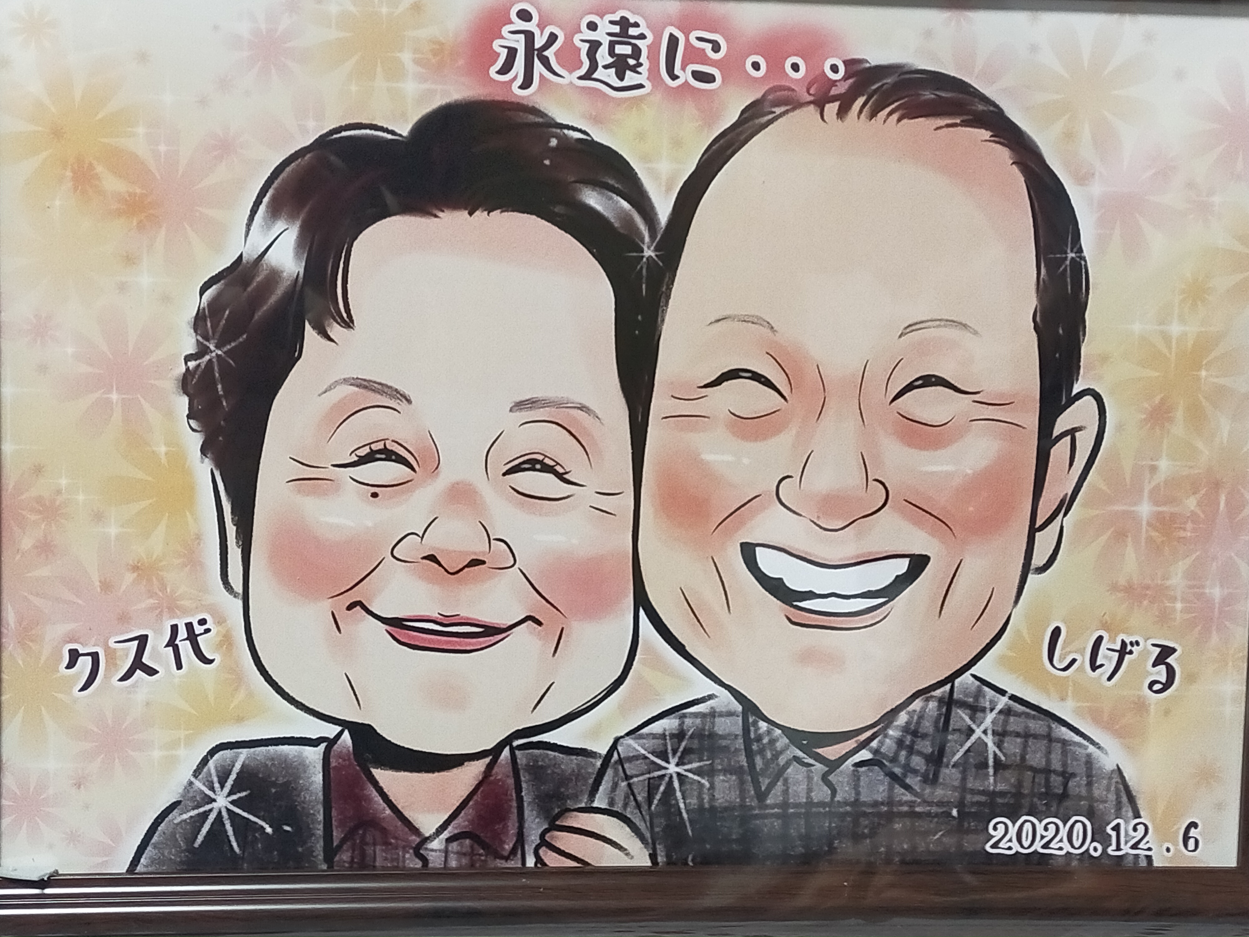 上月先生に『2人最上級の幸せそうな顔に描いて下さい』とお願いしたところ『心を込めて描かせて頂きます。』とのメールを頂きました。1週間足らずで作品が届きました。まず開封した私の目に両親の満面の笑みが飛び込んできて涙が止まりませんでした。早速母に届けたところ作品を観てその場に泣き崩れました。「お父ちゃんが笑ってる…お父ちゃんが笑ってる…」と繰り返しながら。「これでずっとお父ちゃんと一緒に居れる…」とも。たった数枚送らせてもらった写真でここまでリアルにそして温かい作品を本当にありがとうございました。母に最高のプレゼントが出来ました。