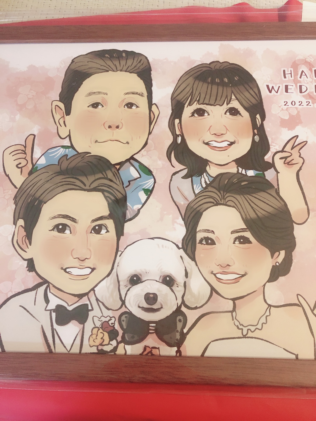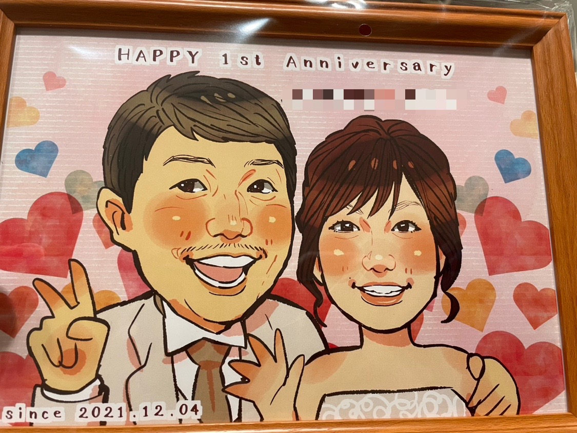 上月先生に『2人最上級の幸せそうな顔に描いて下さい』とお願いしたところ『心を込めて描かせて頂きます。』とのメールを頂きました。1週間足らずで作品が届きました。まず開封した私の目に両親の満面の笑みが飛び込んできて涙が止まりませんでした。早速母に届けたところ作品を観てその場に泣き崩れました。「お父ちゃんが笑ってる…お父ちゃんが笑ってる…」と繰り返しながら。「これでずっとお父ちゃんと一緒に居れる…」とも。たった数枚送らせてもらった写真でここまでリアルにそして温かい作品を本当にありがとうございました。母に最高のプレゼントが出来ました。