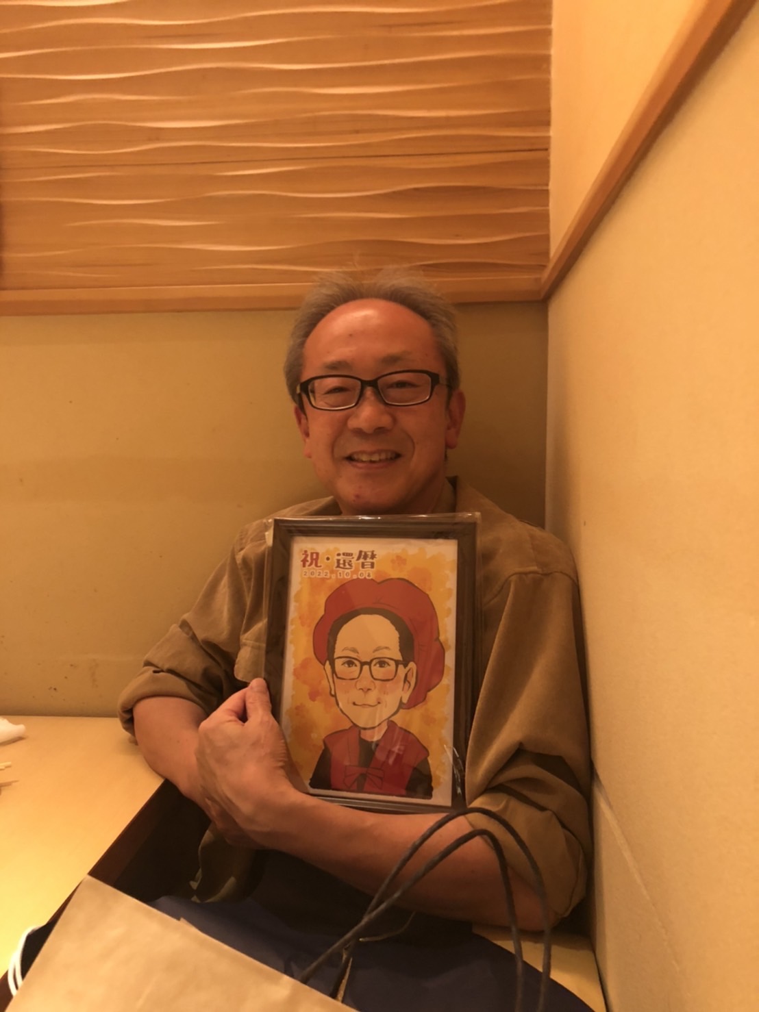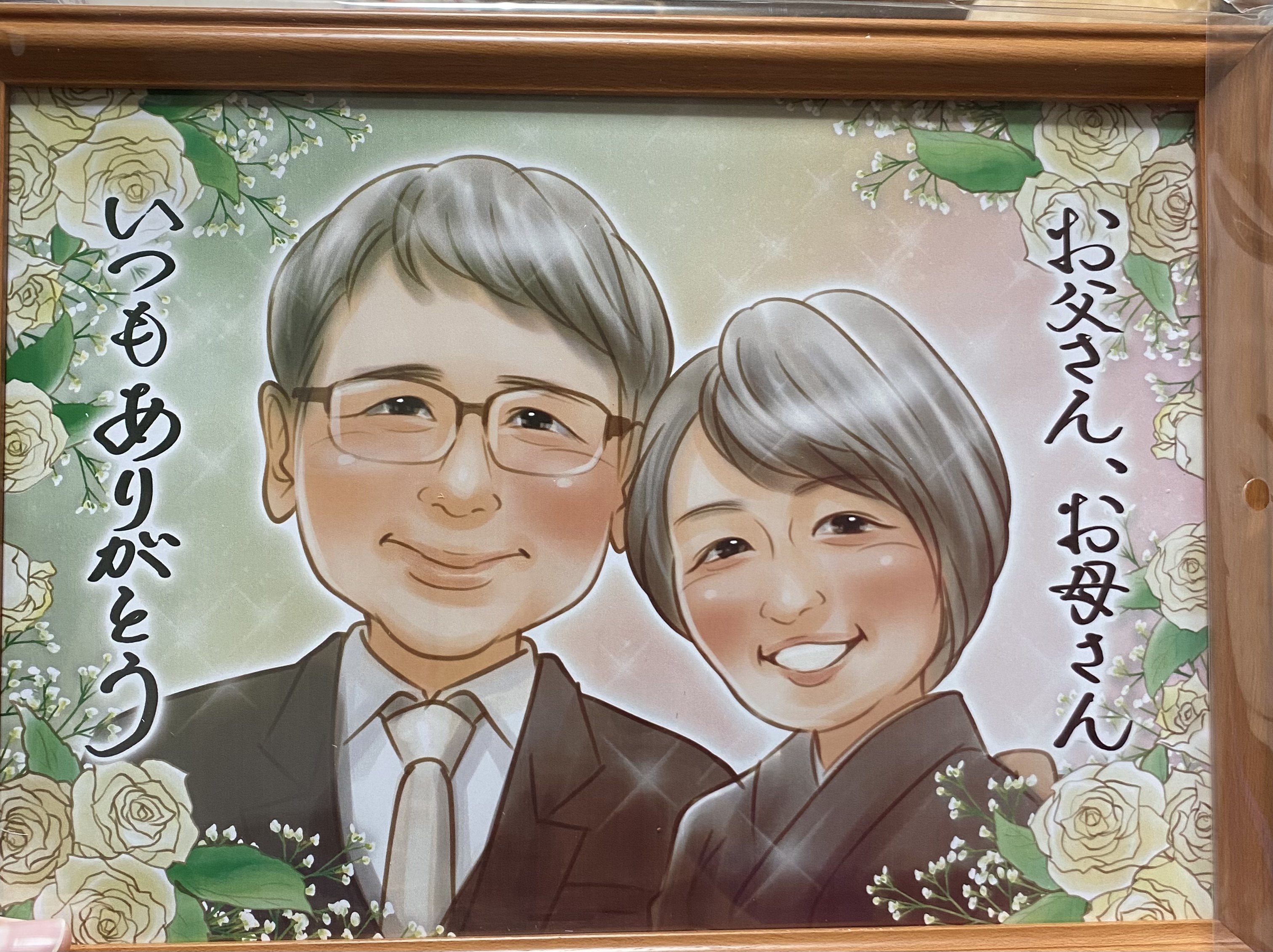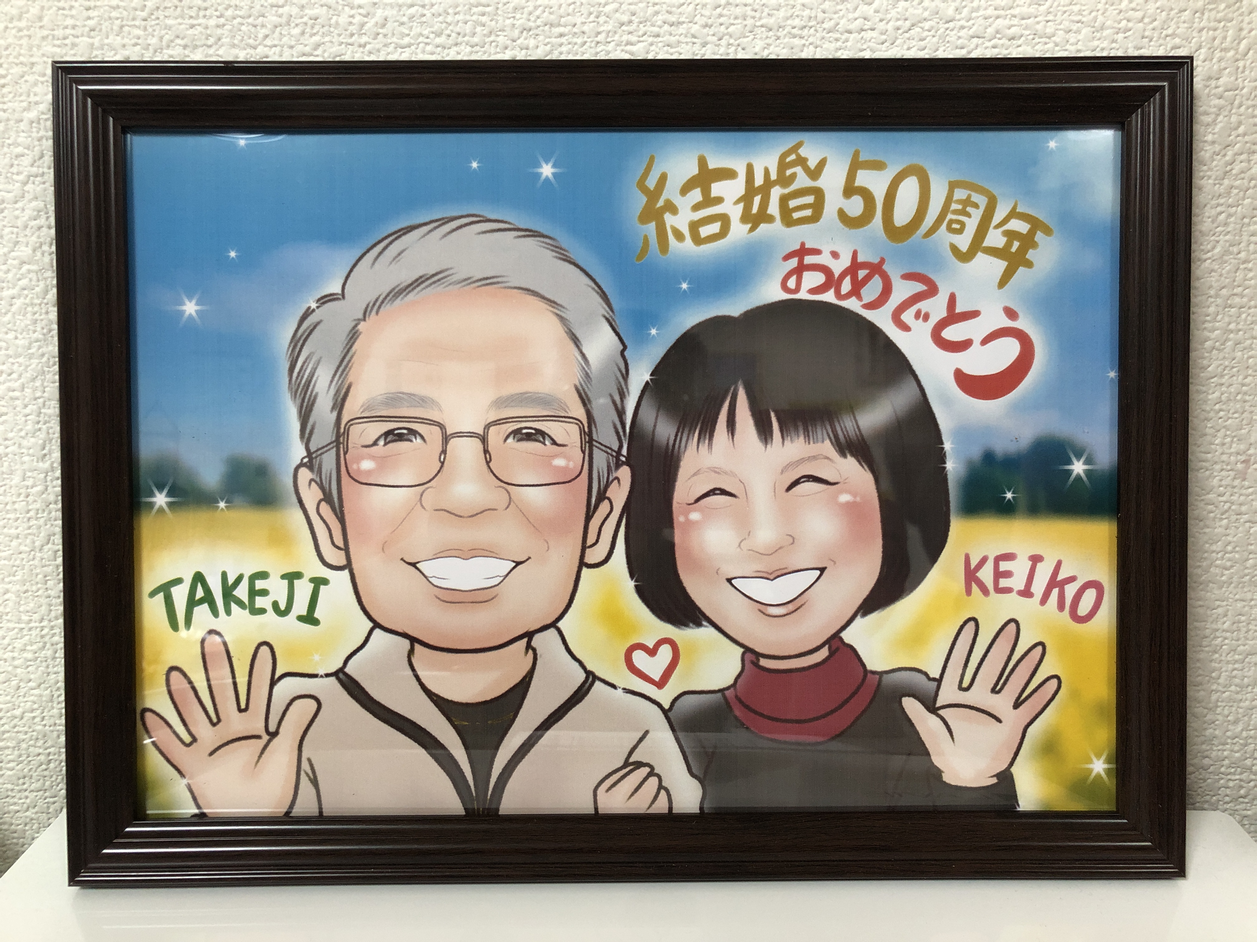 とても雰囲気のよい似顔絵に仕上がってました。父も母も似ててびっくりしました。いつも、お世話になってる両親にこころ温まるプレゼントになりました。来週、金婚式のパーティーで似顔絵を披露してプレゼントする予定です。必ず気に入ってもらえると思ってます。ほんとにありがとうございました。また、機会があれば利用させて頂こうと思います。ありがとうございました。