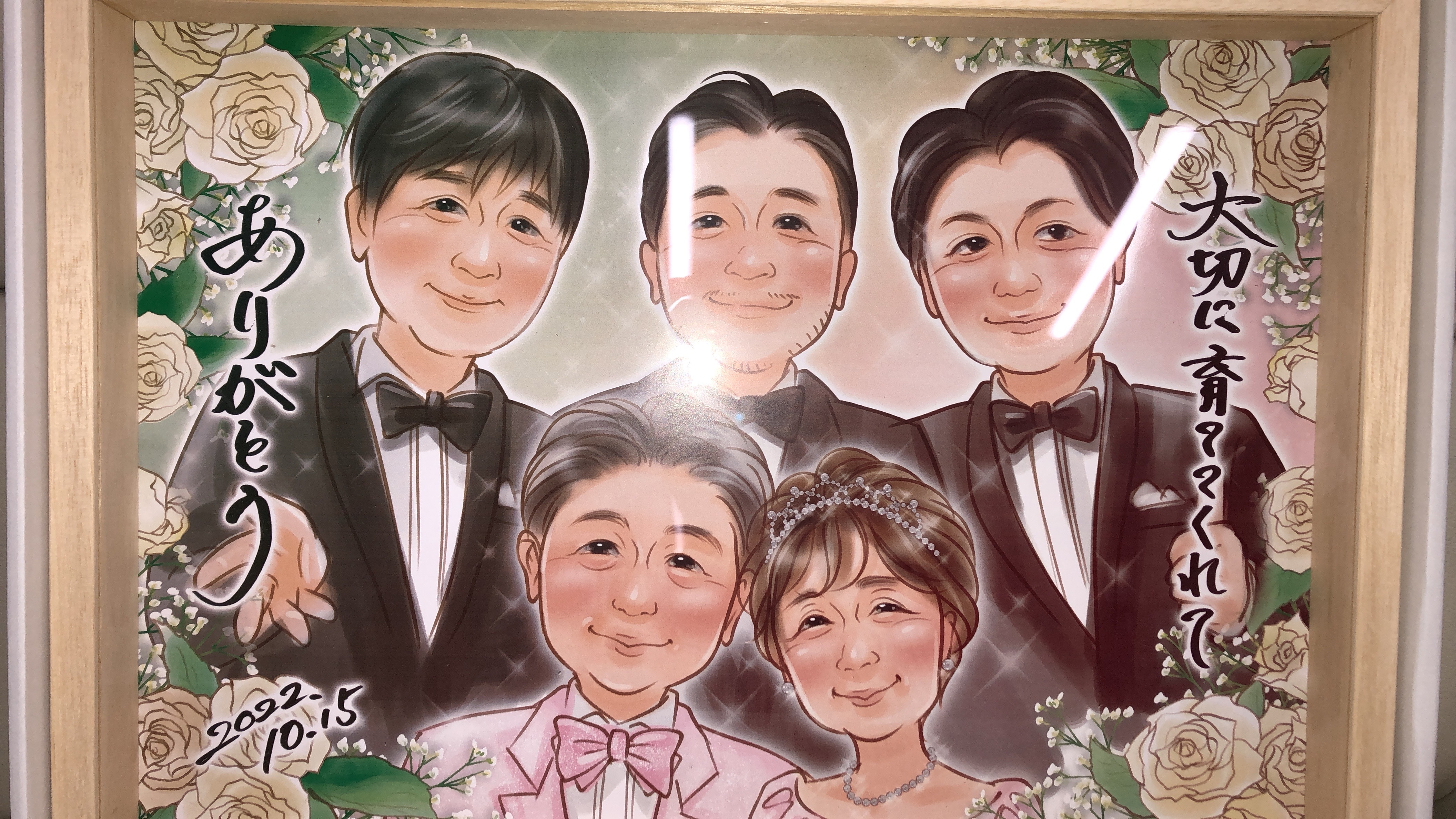 親の結婚50周年で似顔絵を描いていただきました。写真だけで上手く描けるかなと不安があったのですが、実際に届いて見てみたら、和やかな雰囲気で描いていただいて期待以上の出来栄えに非常に満足しています。親にプレゼントとして渡したらとても喜んでました。似顔絵プレゼントが良いものだと実感できました。また、機会を見つけて利用したいと思います。