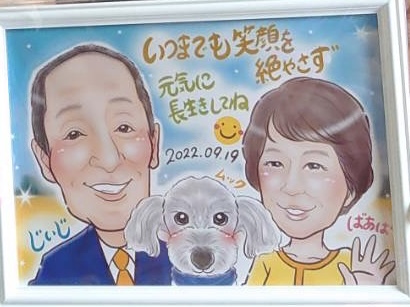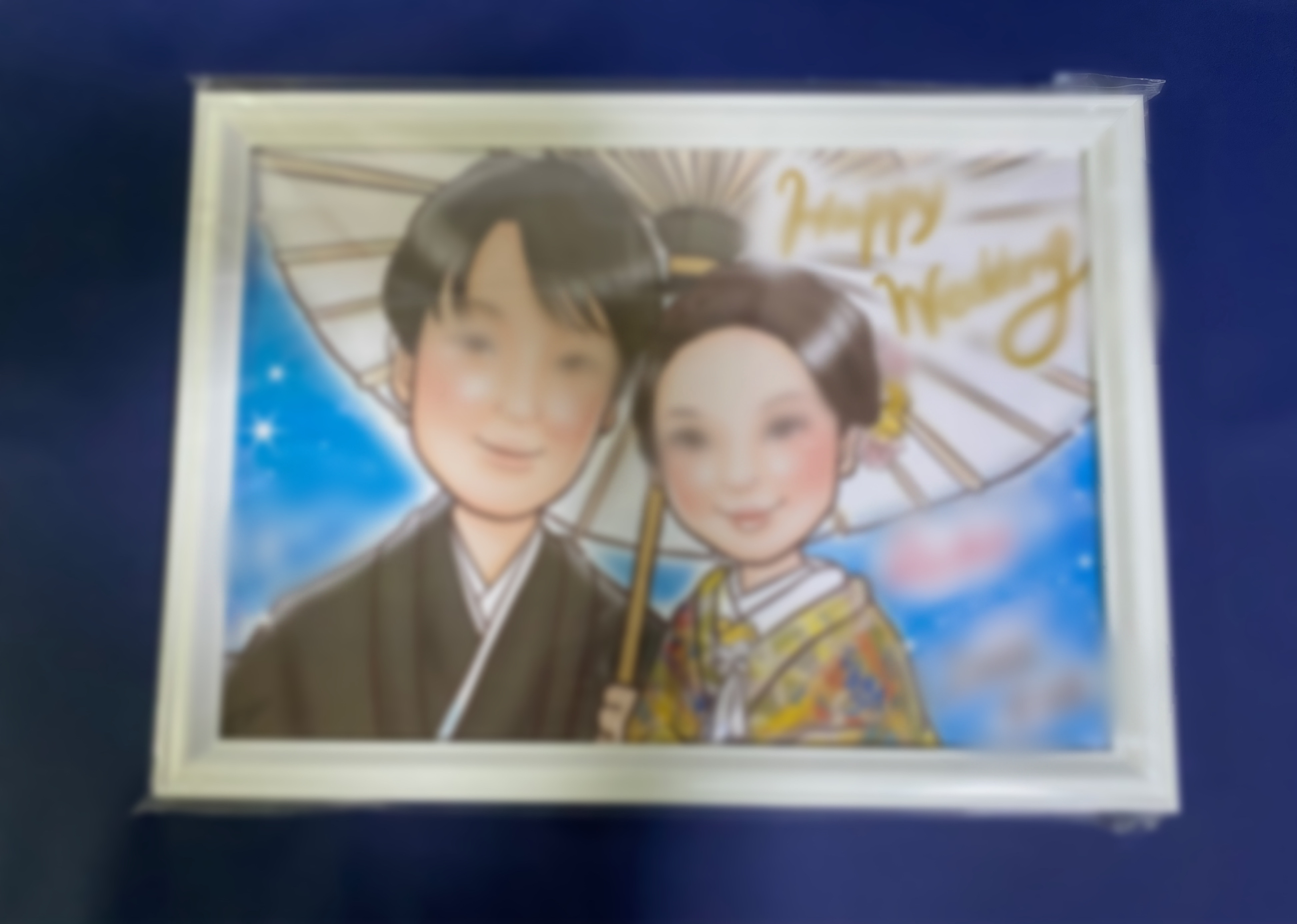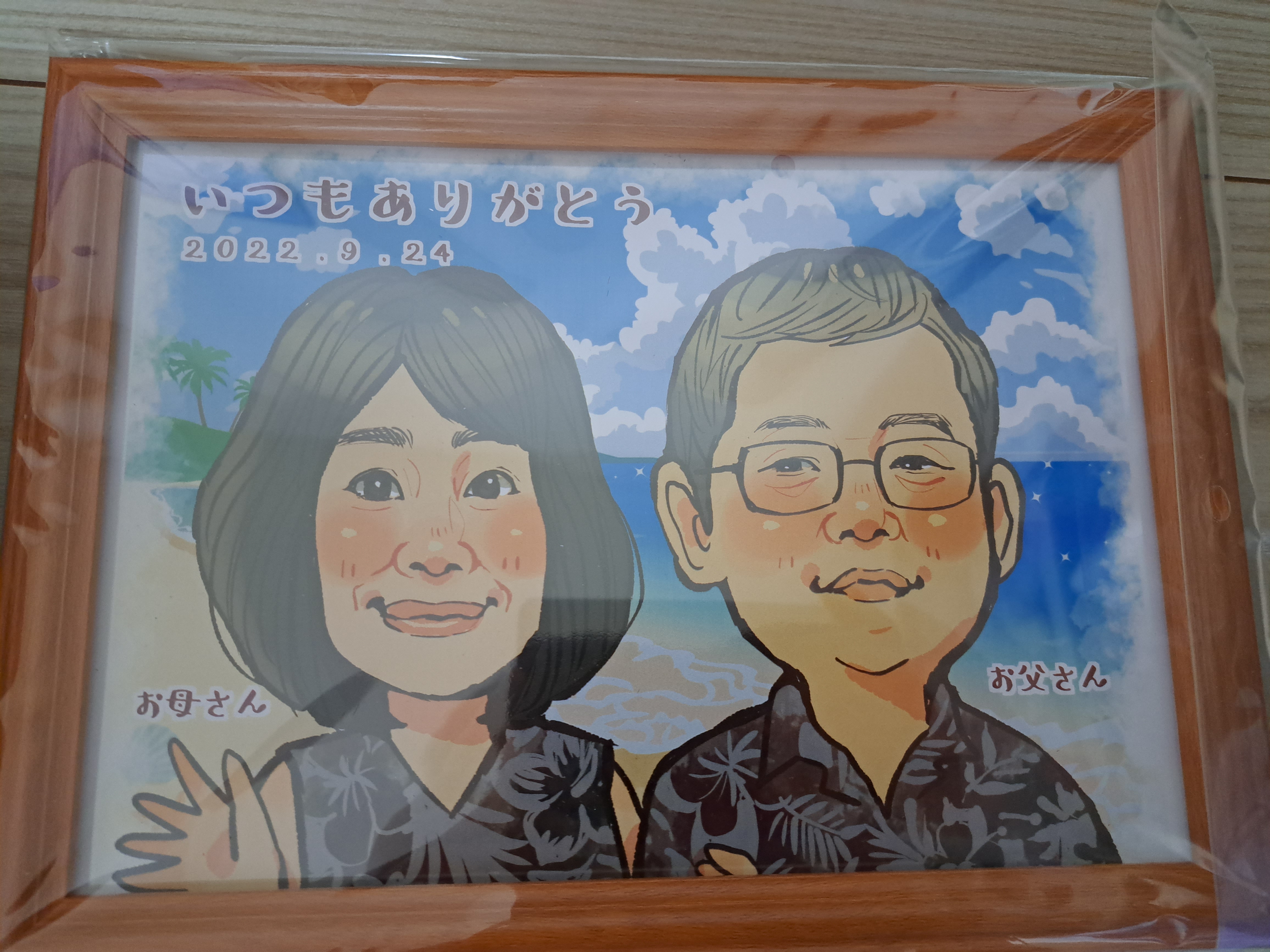 結婚式での両親へのプレゼントとして注文しました。 届いた絵を確認しましたが、特徴をとらえており、似ており笑ってしまいました。 急な注文にも関わらず、最大限配慮していただき、結婚式には間に合いました。人気の絵師さんは納期がかかりますので、お早めに注文することをオススメします。この度は本当にありがとうございました。