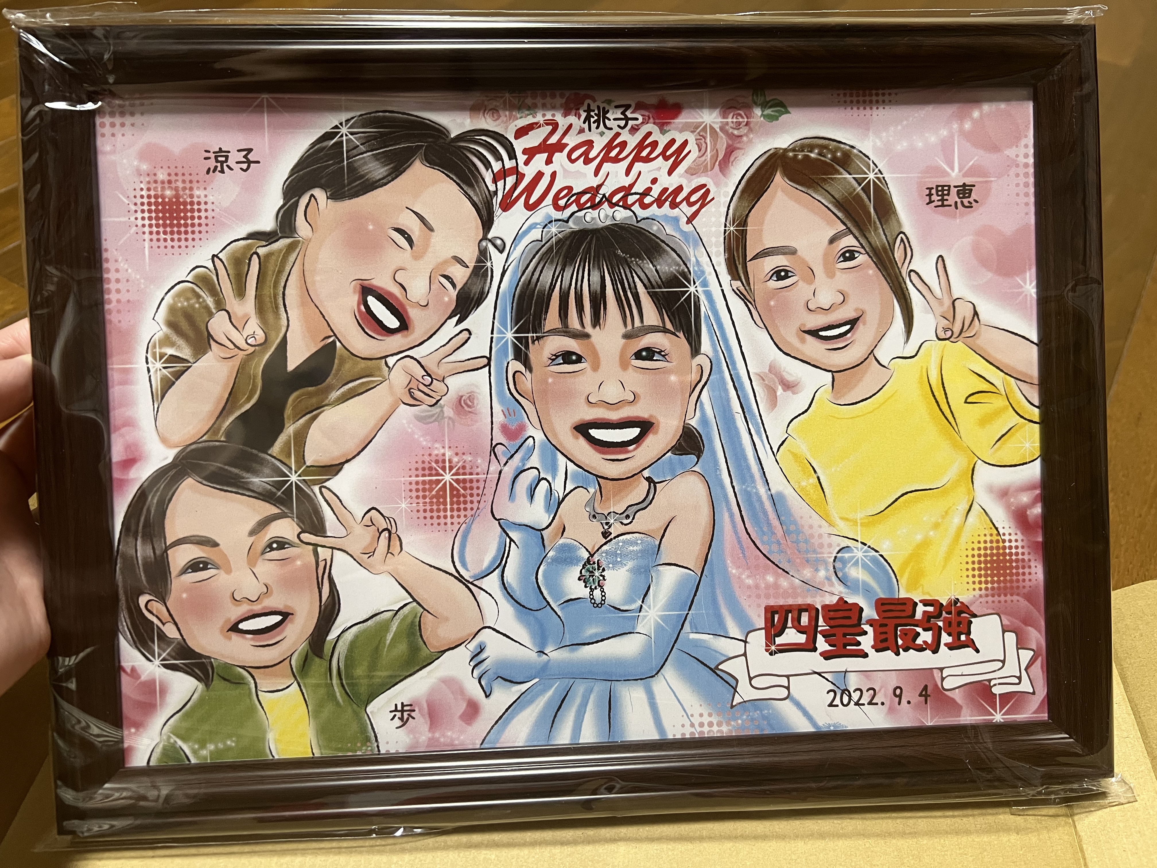父親の生前の写真でも20年〜30年前の写真で、今生きてたらこんな感じだったのかぁと、こちらが感心してしまいました。結婚式前にずっと似顔絵見てて感動したのはここだけの秘密です笑