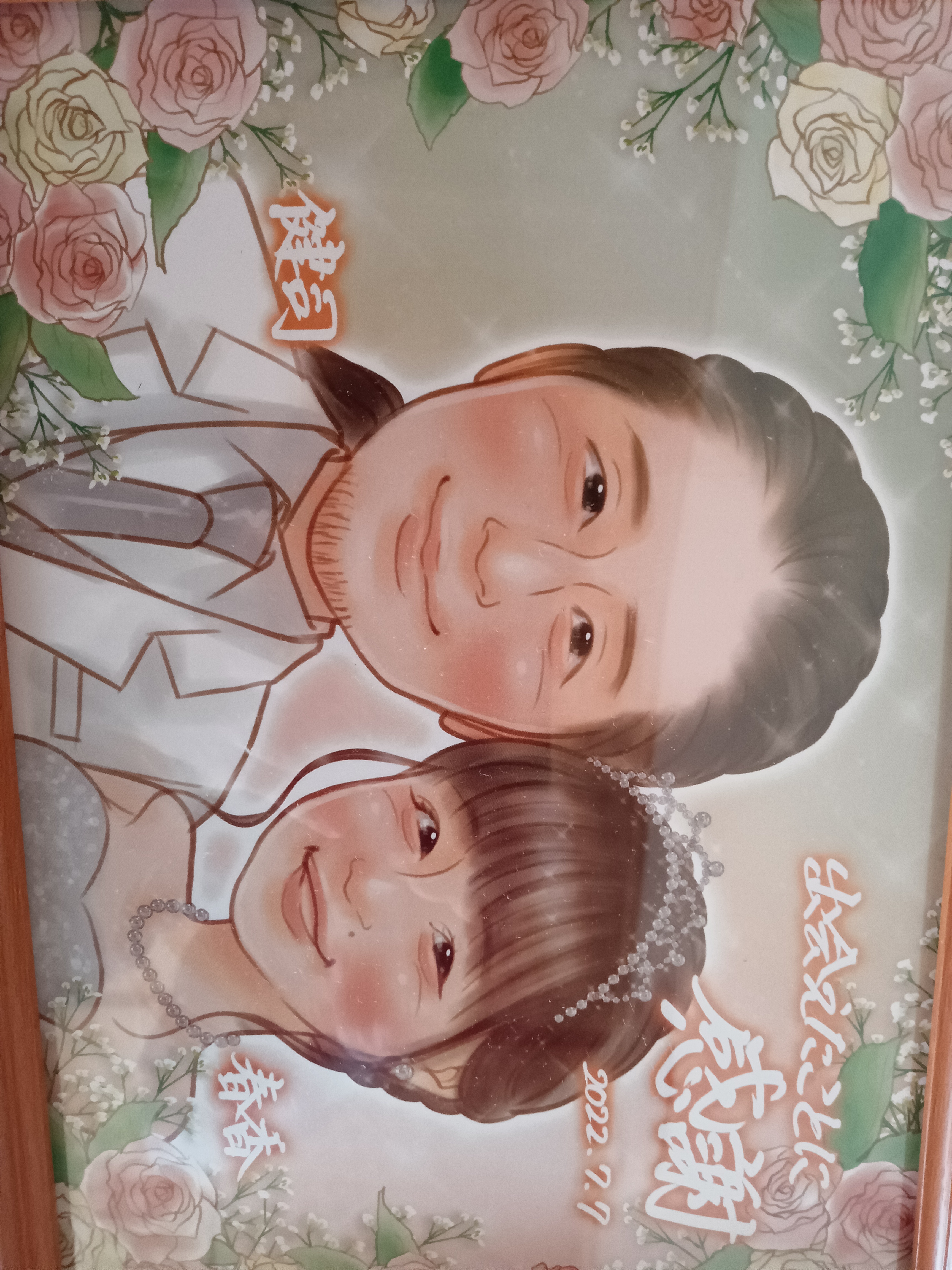 父親の生前の写真でも20年〜30年前の写真で、今生きてたらこんな感じだったのかぁと、こちらが感心してしまいました。結婚式前にずっと似顔絵見てて感動したのはここだけの秘密です笑
