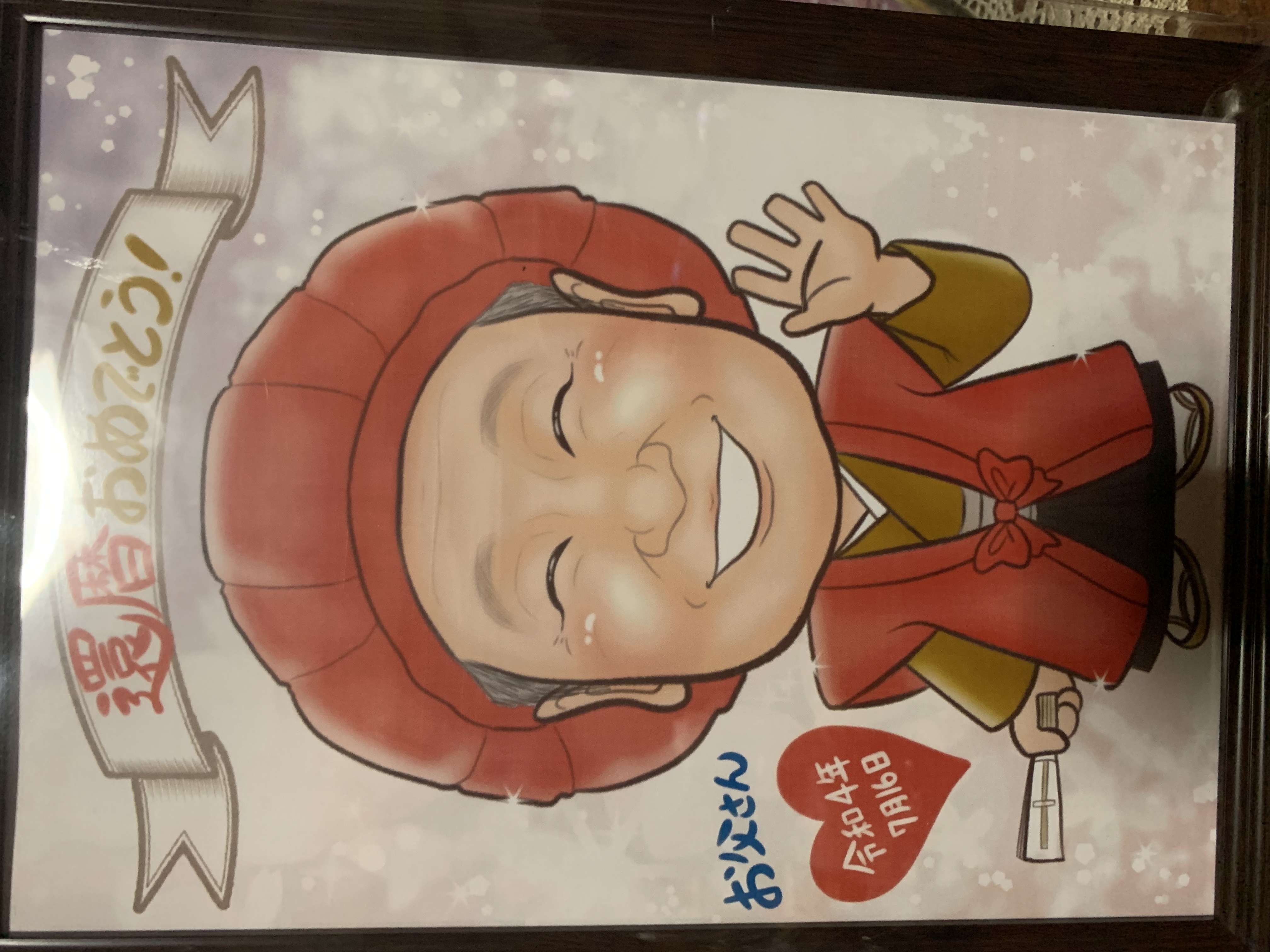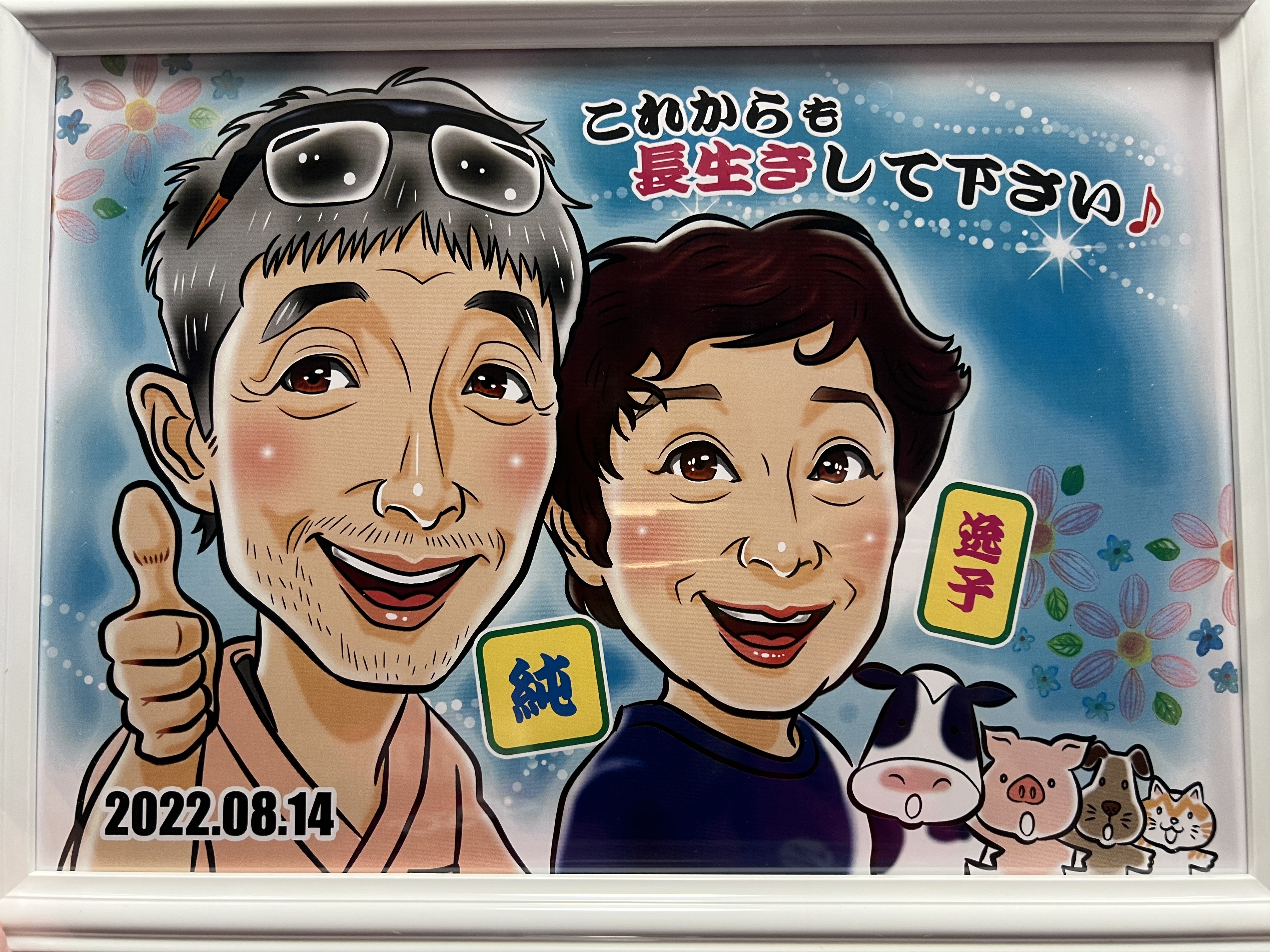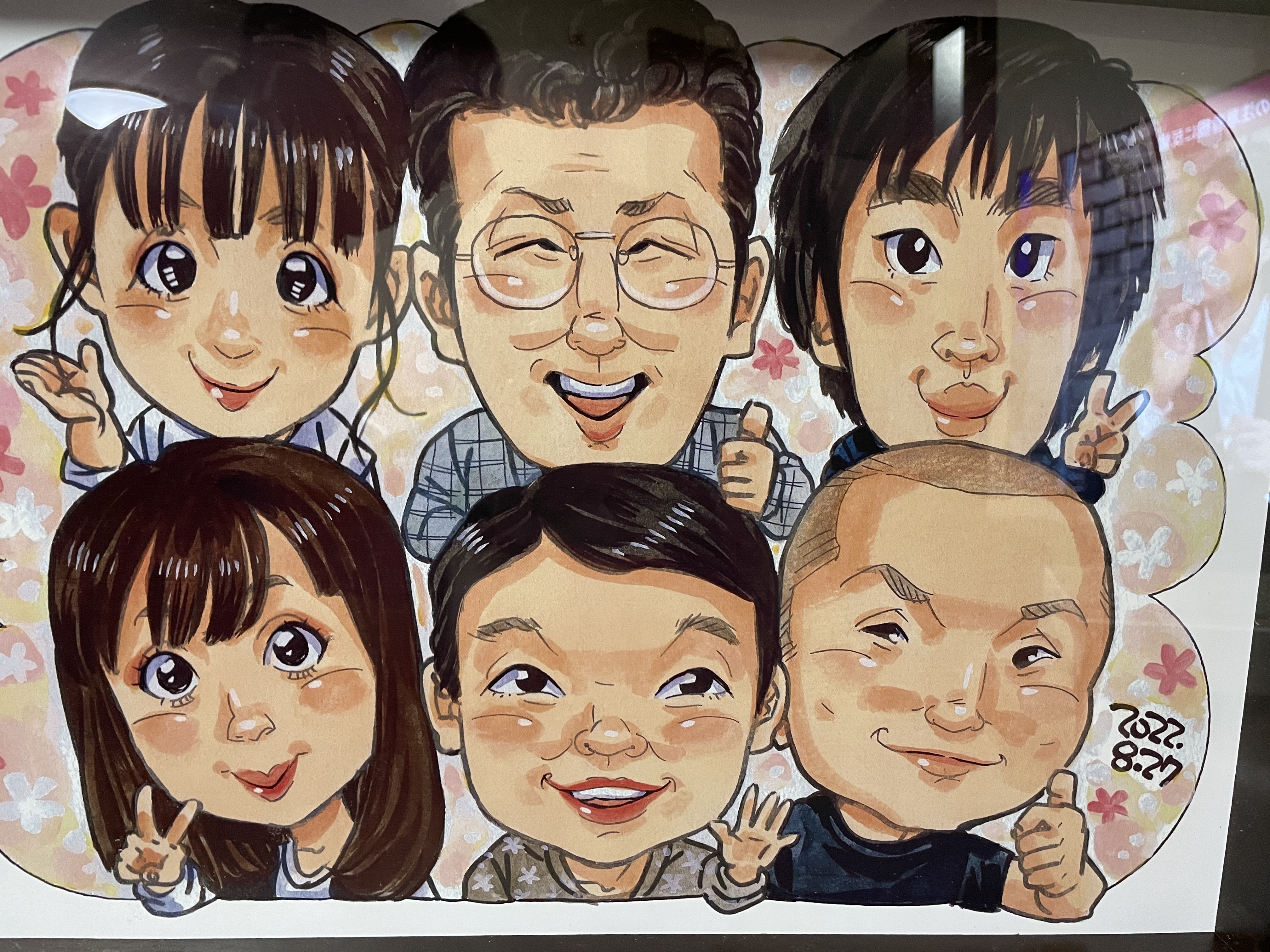 今回、コロナ禍の影響で約8年ぶりに親戚一同が集まるという事もあり、サプライズで子供・孫からのプレゼントとして発注させて頂きました。2家族分注文させて頂きましたが、とても鮮明な似顔絵で写真の特徴をしっかり捉えたクオリティーの高い似顔絵が手元に届きました。現代のカメラ・携帯カメラは鮮明な写りで顔の表情を映し出してくれますが、似顔絵の場合、蛍光色を使用することで写真には無い、色彩の表現を全面に映し出してくれるのでとても綺麗な作品だと感じました。お盆休みに渡すまで時間が待ち遠しいですが、似顔絵のフレーム(額縁)際に、子供・孫たちが写った写メを何枚か入れてみて、さらに似顔絵に花を咲かせてみようかと思います。ありがとうございました。