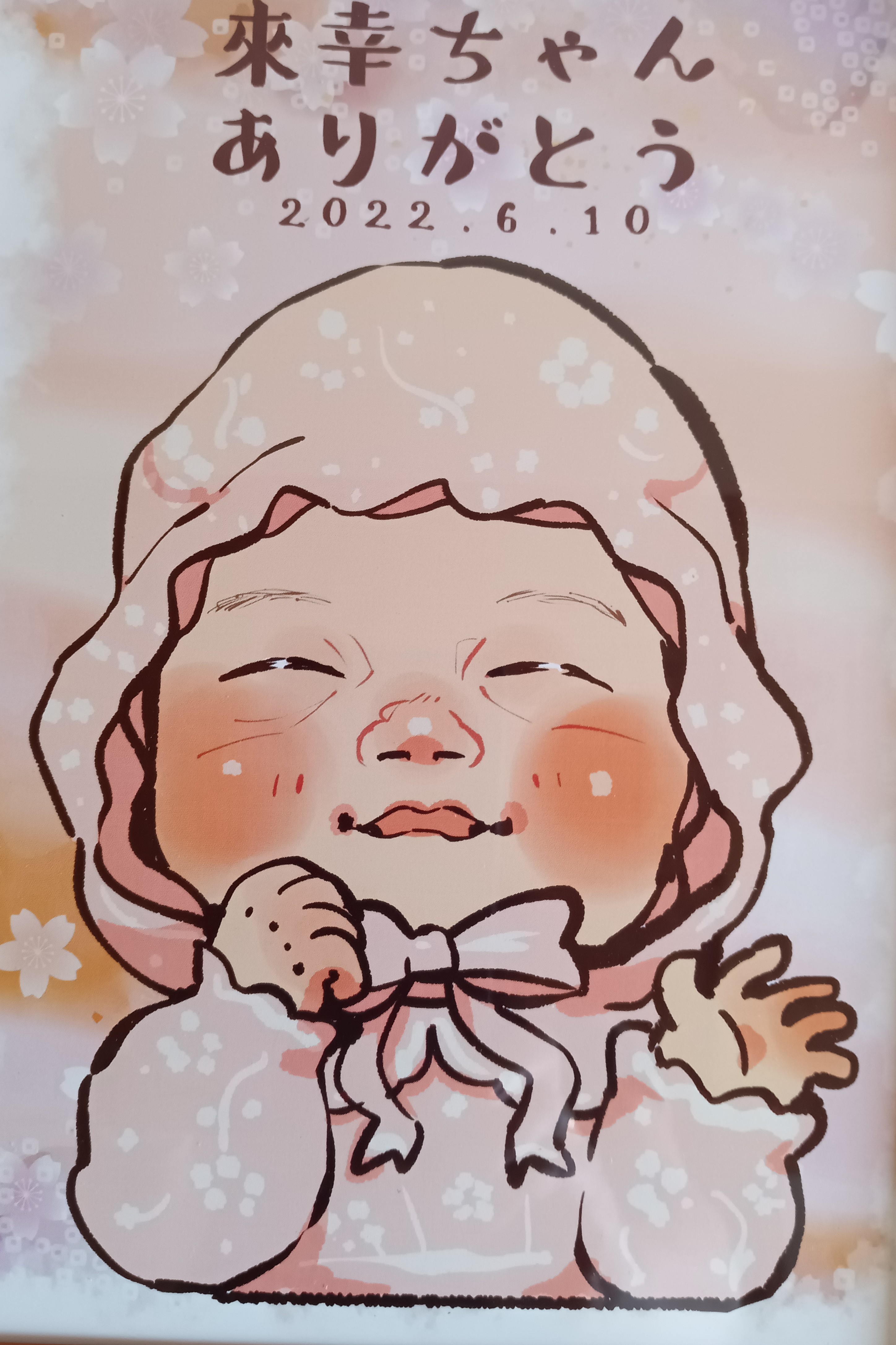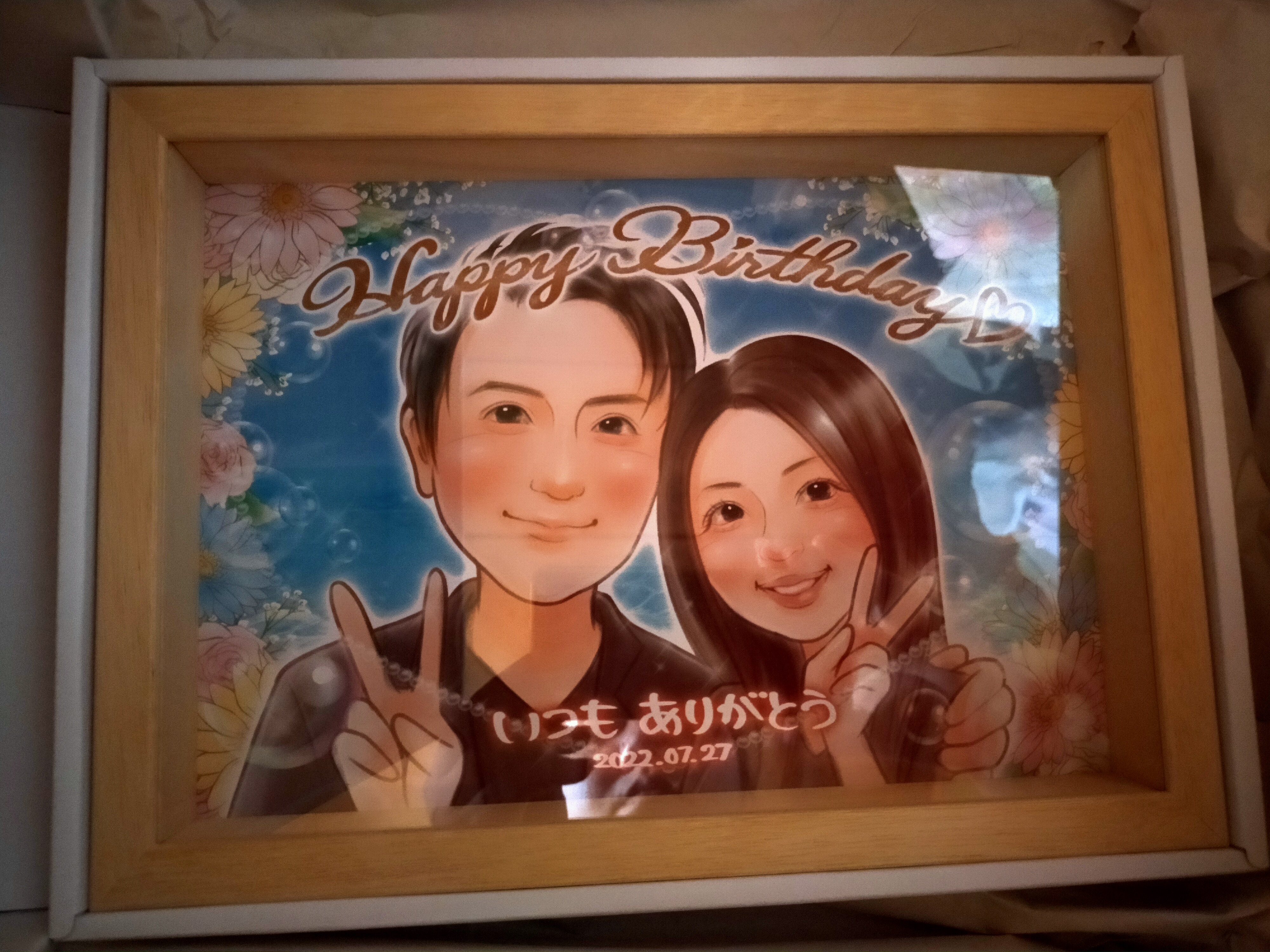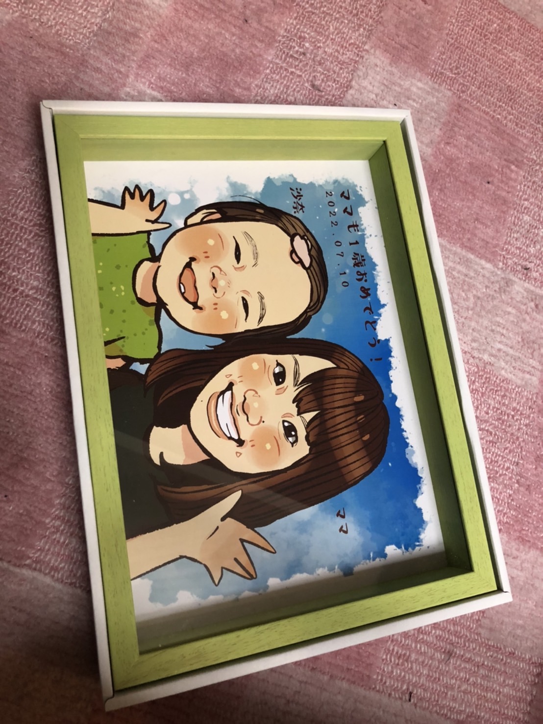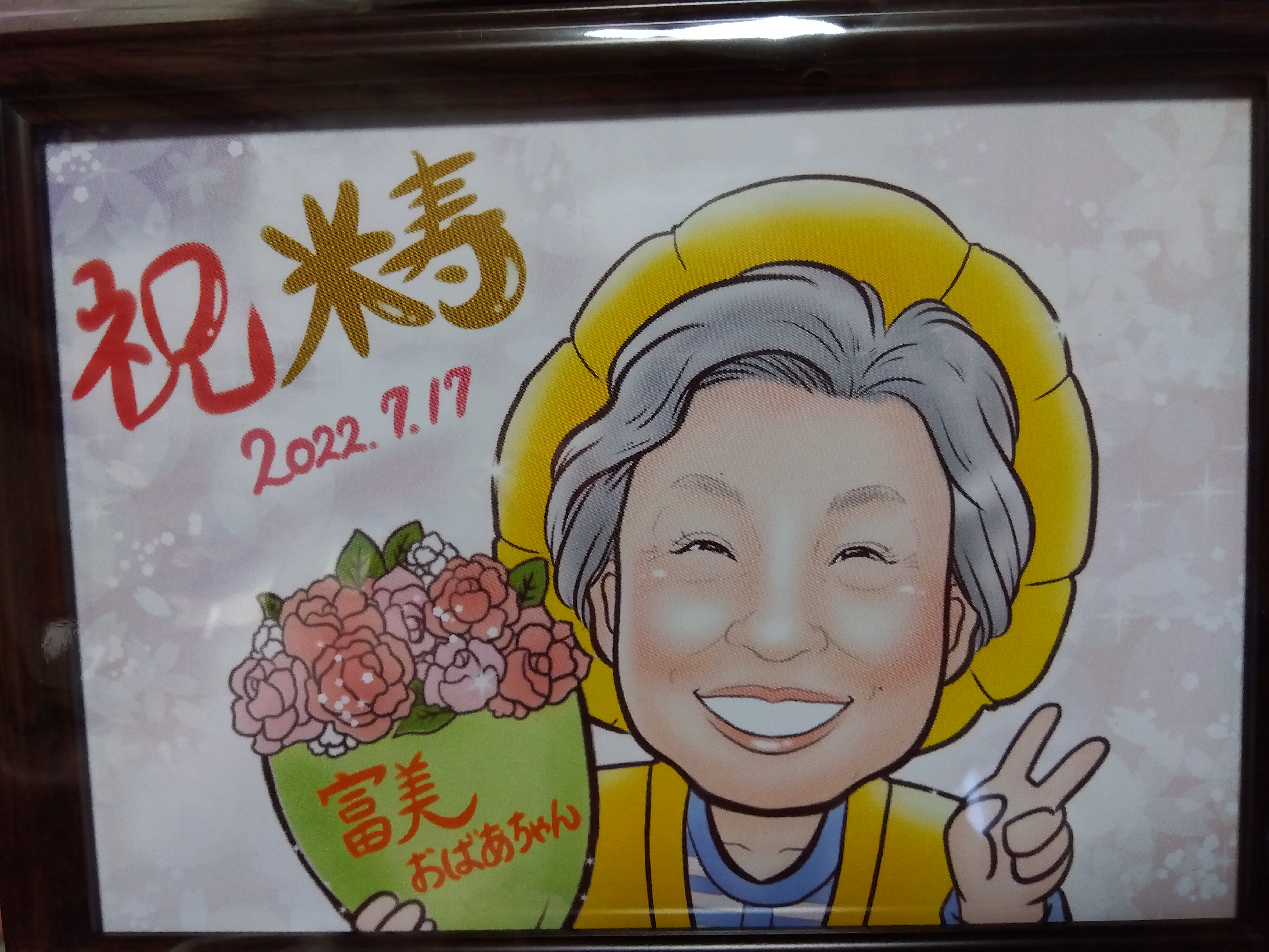 今回、コロナ禍の影響で約8年ぶりに親戚一同が集まるという事もあり、サプライズで子供・孫からのプレゼントとして発注させて頂きました。2家族分注文させて頂きましたが、とても鮮明な似顔絵で写真の特徴をしっかり捉えたクオリティーの高い似顔絵が手元に届きました。現代のカメラ・携帯カメラは鮮明な写りで顔の表情を映し出してくれますが、似顔絵の場合、蛍光色を使用することで写真には無い、色彩の表現を全面に映し出してくれるのでとても綺麗な作品だと感じました。お盆休みに渡すまで時間が待ち遠しいですが、似顔絵のフレーム(額縁)際に、子供・孫たちが写った写メを何枚か入れてみて、さらに似顔絵に花を咲かせてみようかと思います。ありがとうございました。