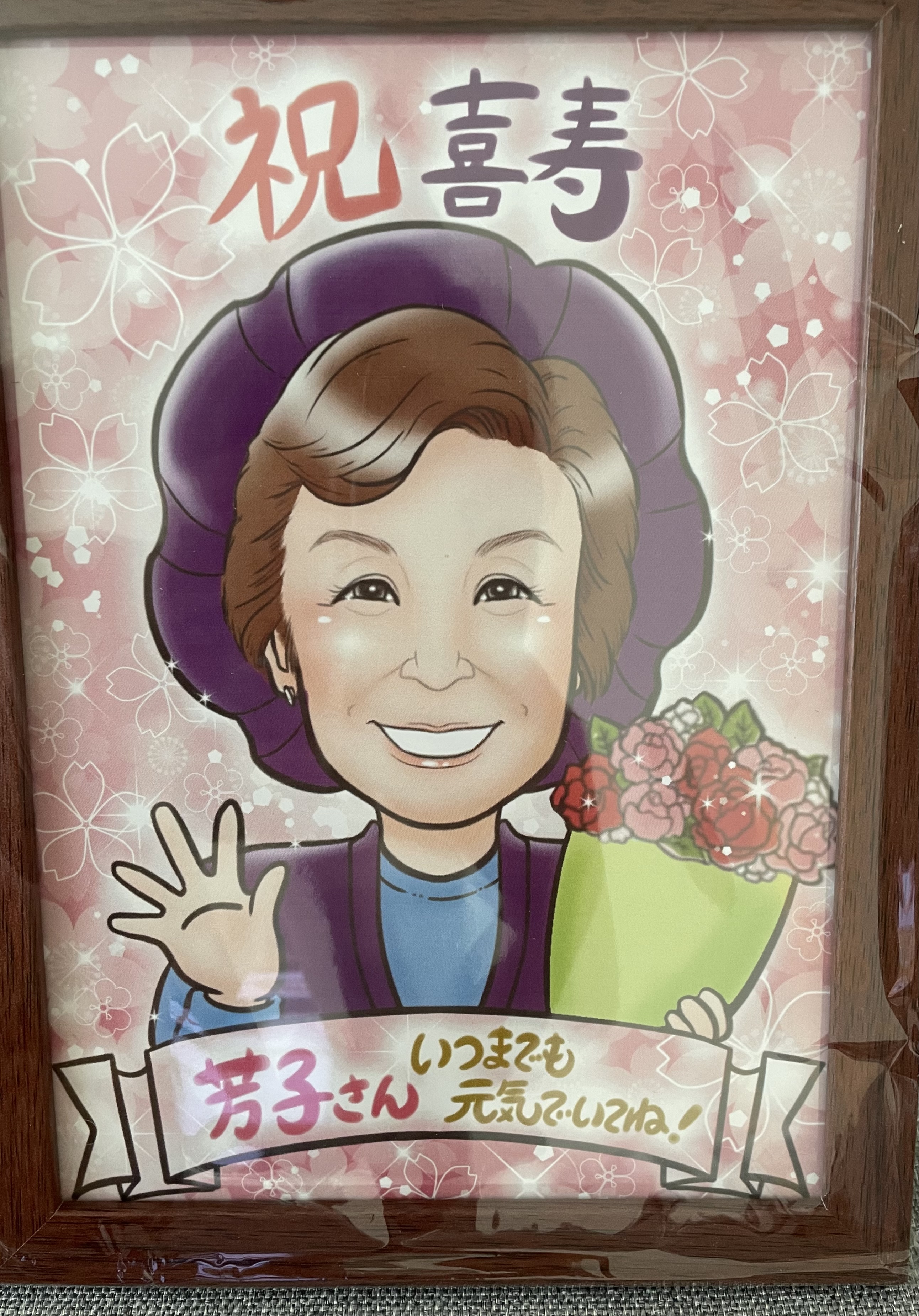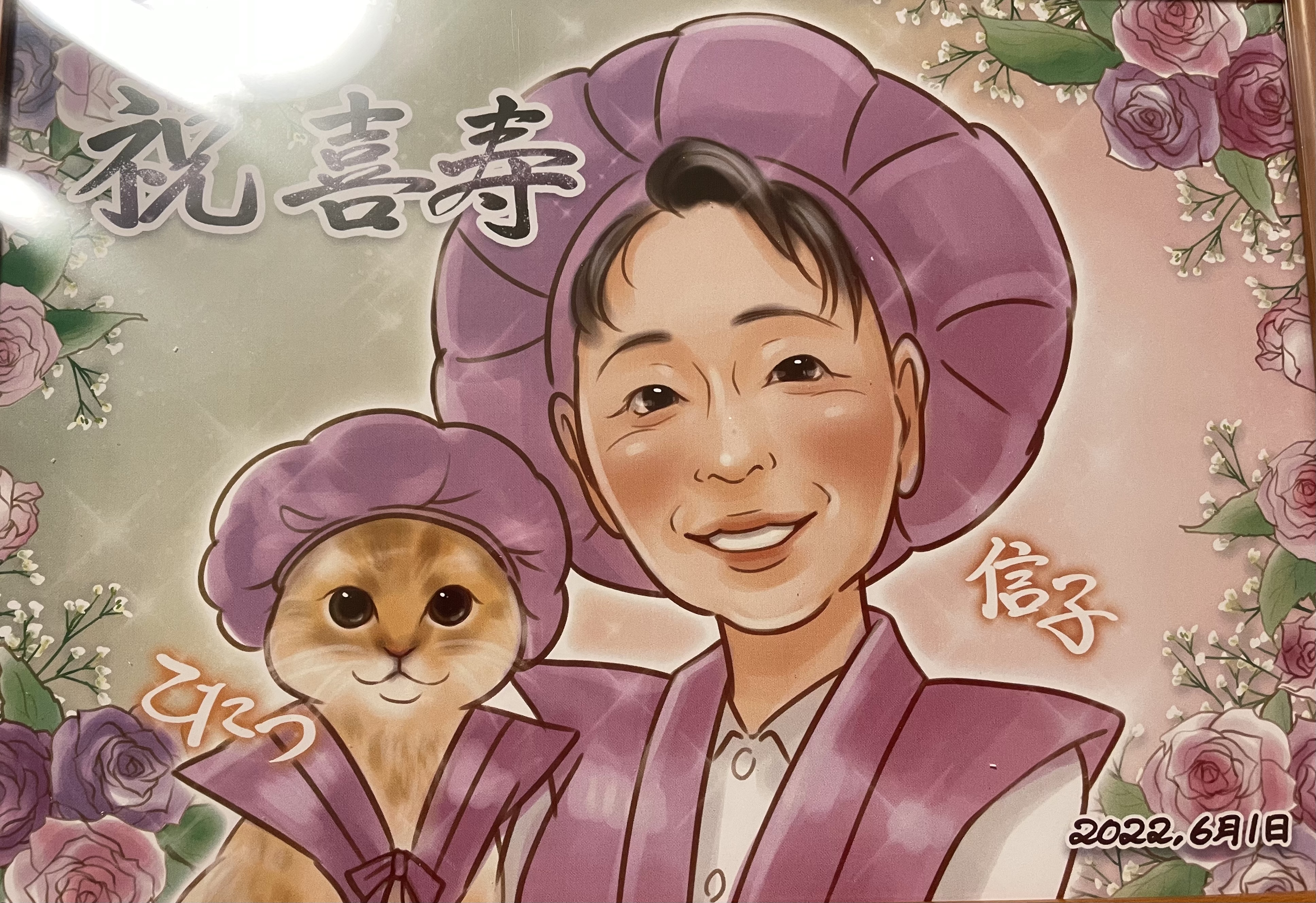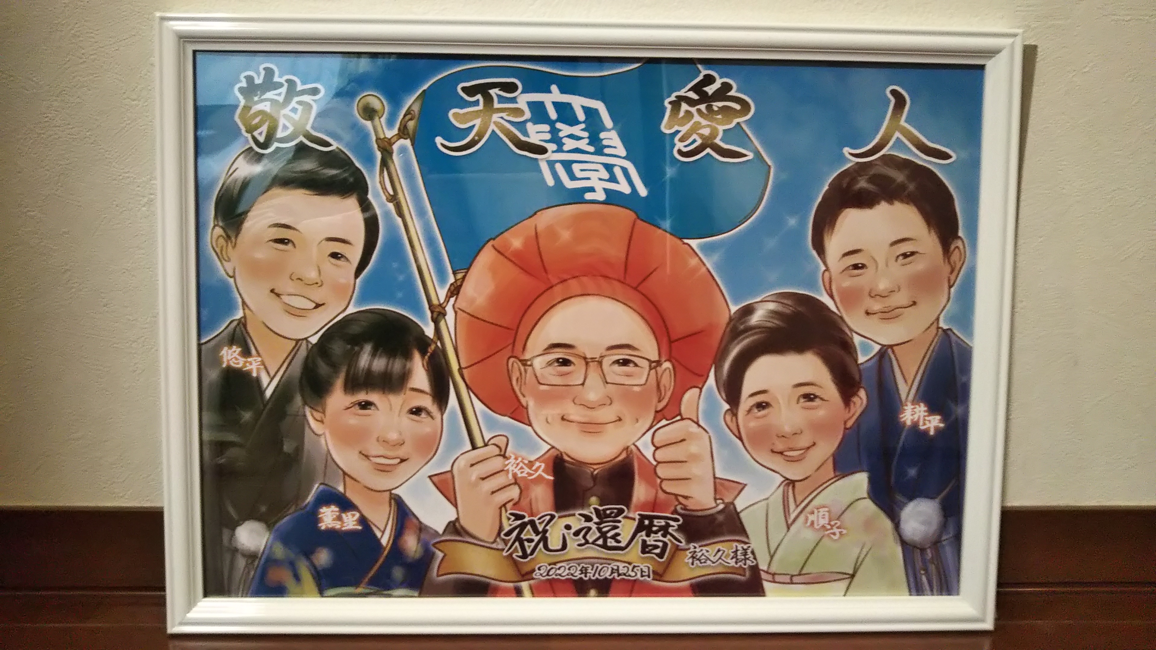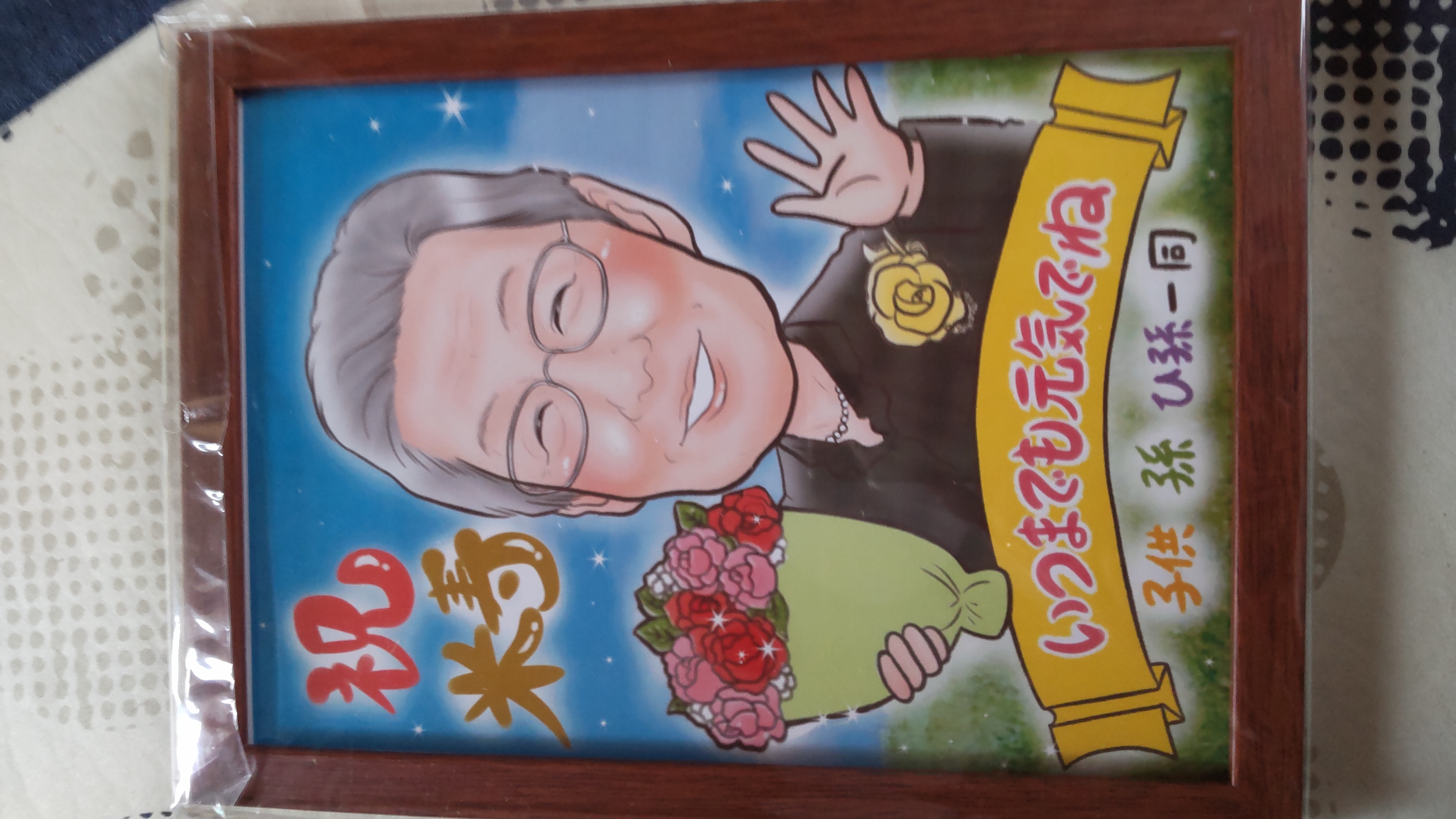 スタッフさん、マルさんに心から感謝致します。 夫のサプライズ還暦祝いにぜひ贈りたいと貴社を探し、馴れないスマホからの画像添付に苦戦やり直しに4時間かけ祈るように申し込んだ甲斐が有りすぎました。想像遥かに越え、希望を深く汲み取って頂き、写真では表せない芸術品に、夫は勿論、家族の喜びようはなかったです。現在もダイニングテーブルに飾り日々夫を、家族を励まし続けてくれています。このご縁を大切にしたいと思っております。これからも世に一点しかない宝物を描き続けていって下さいませm(__)m