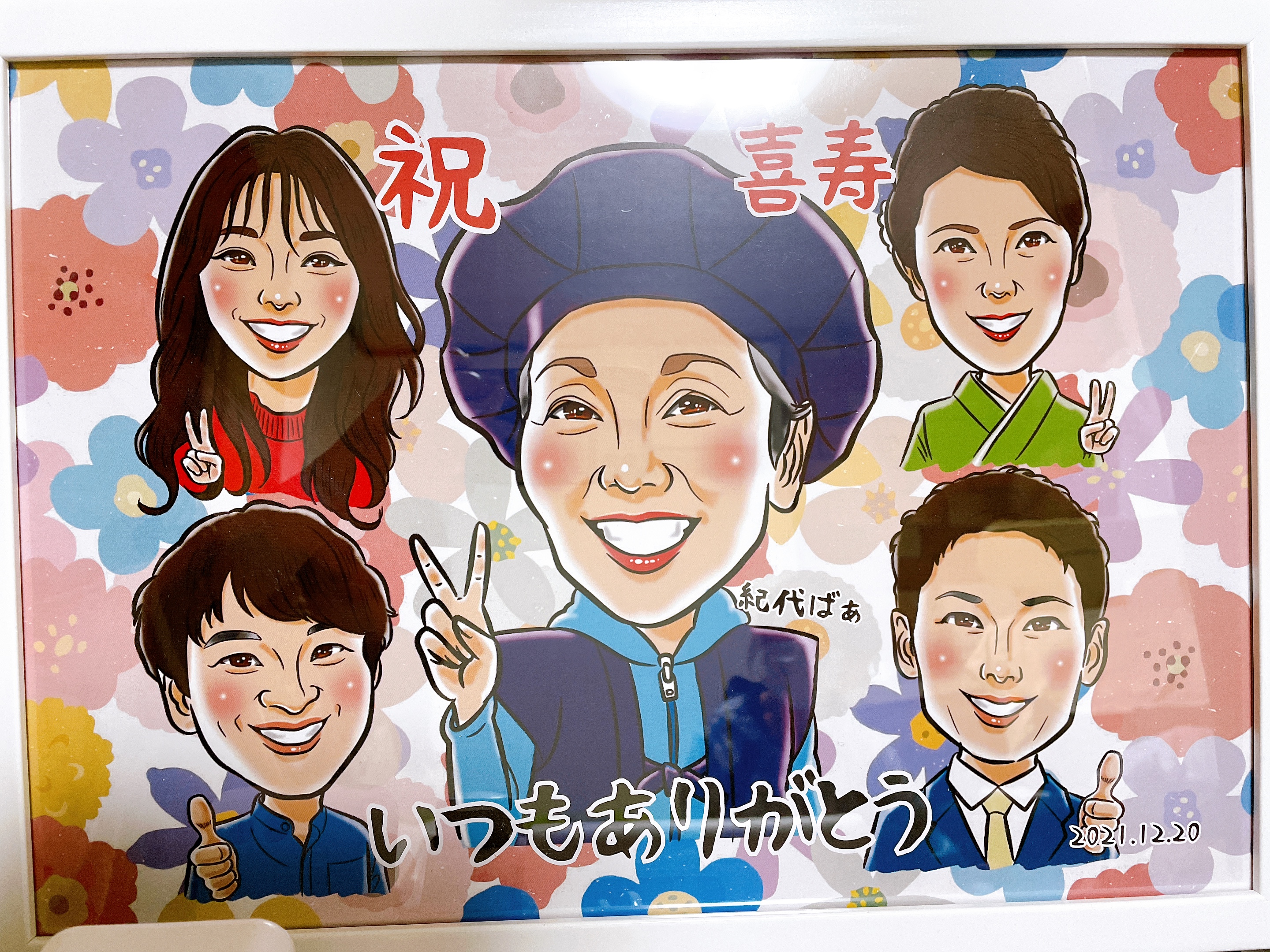 祖母の喜寿祝いで初めて似顔絵を依頼しました。クセのある似顔絵は好きではなかったので、シンさんのクセのない、でも特徴をしっかり掴んだ絵はとても気に入りました!祖母も大変気に入って大切に飾ってくれています。友達や親戚に見せてもいい絵!と誉めてもらえるので、似顔絵を依頼して本当に正解だと思いました。またよろしくお願いします。