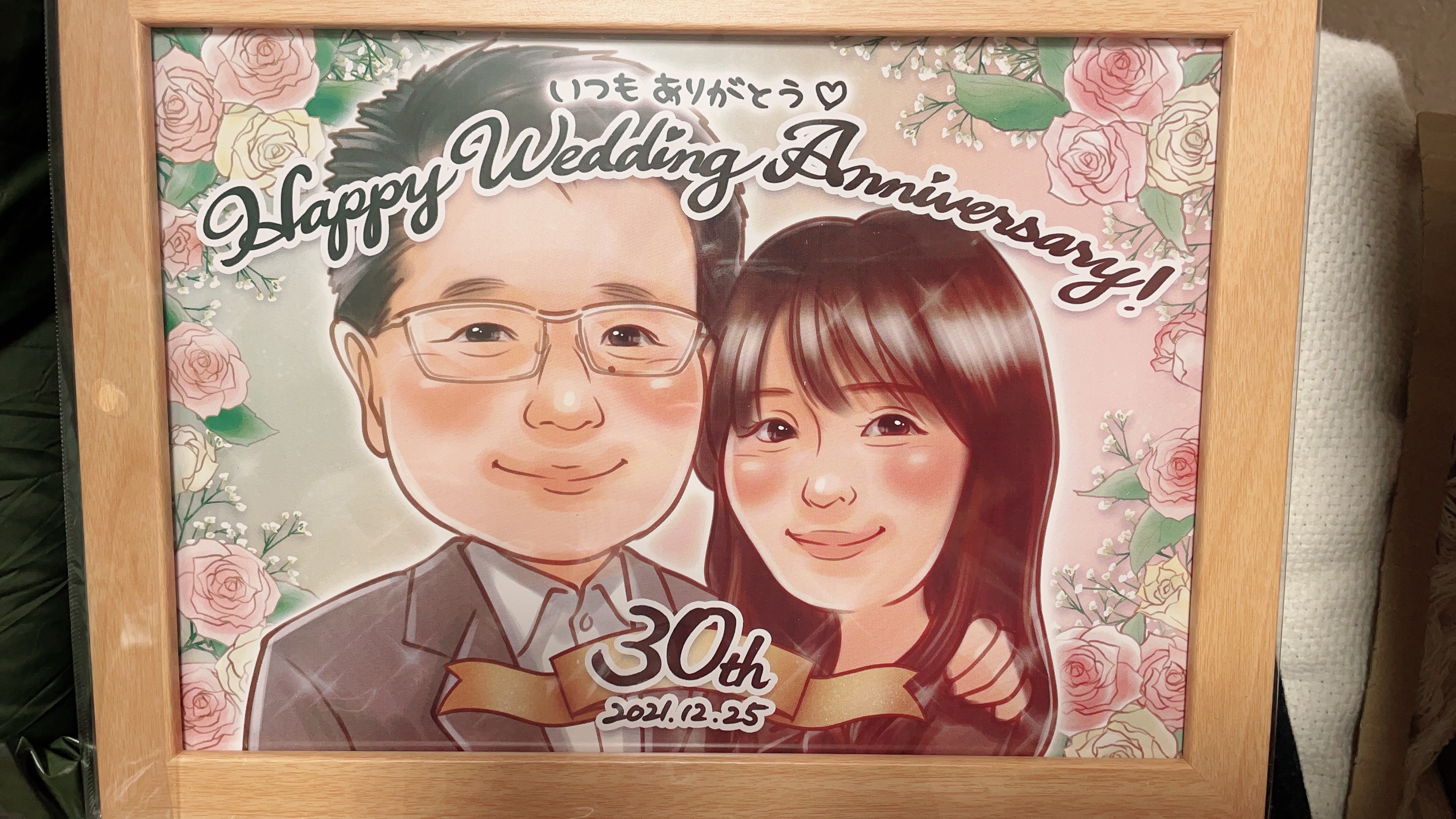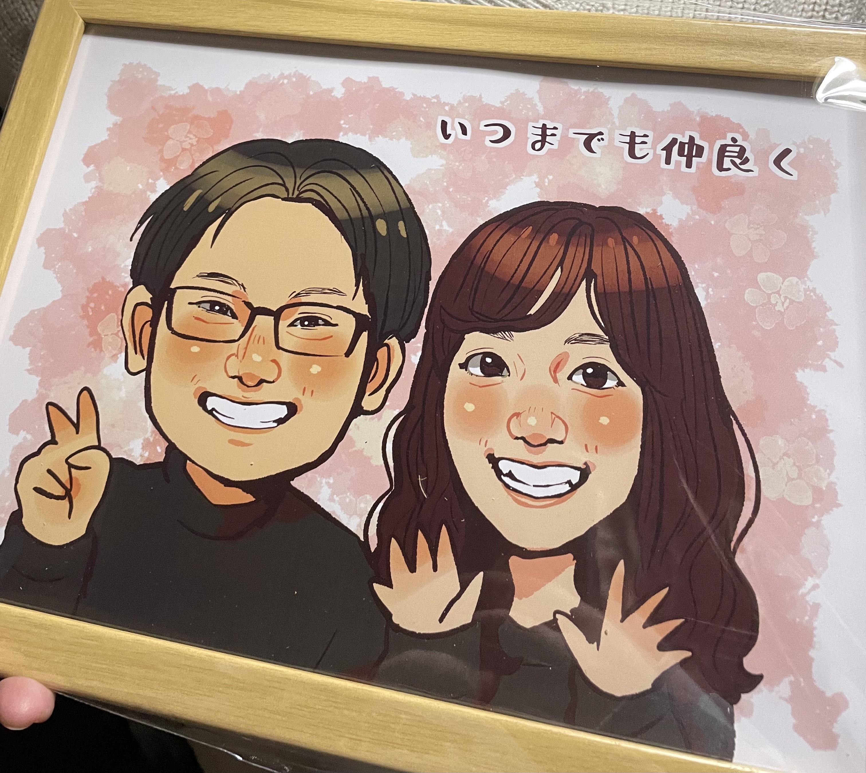 両親への結婚30周年のプレゼント用にお願いしました。注文が混み合っていて、ほしい日までに間に合わず、渡すのが遅くなってしまいましたが、とても可愛い絵で満足です。お値段もお安く、フレームやラッピング袋などもついていたのでとても助かりました。次からお願いするときは、もう少し前もって注文しようと思います。ありがとうございました。