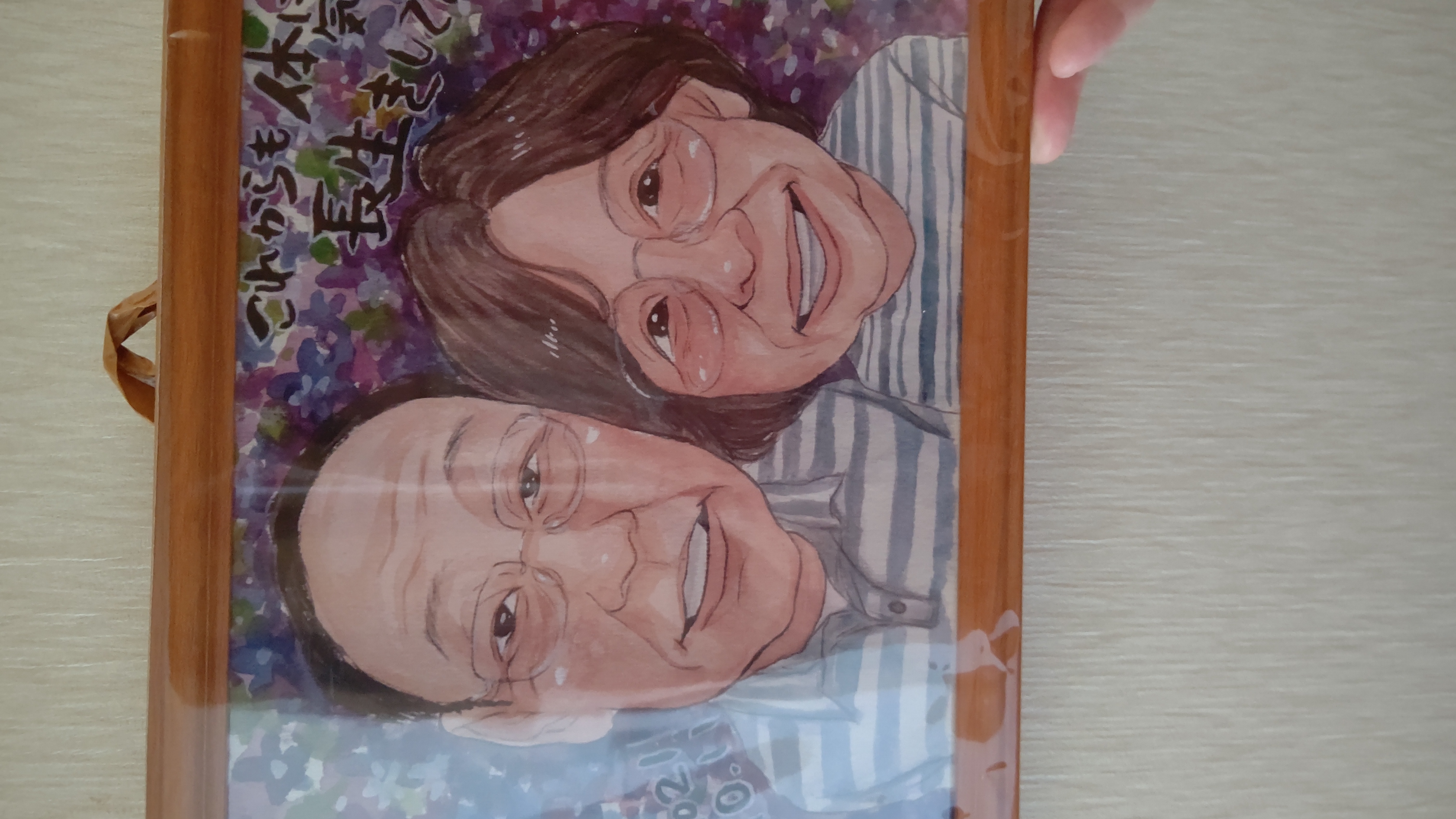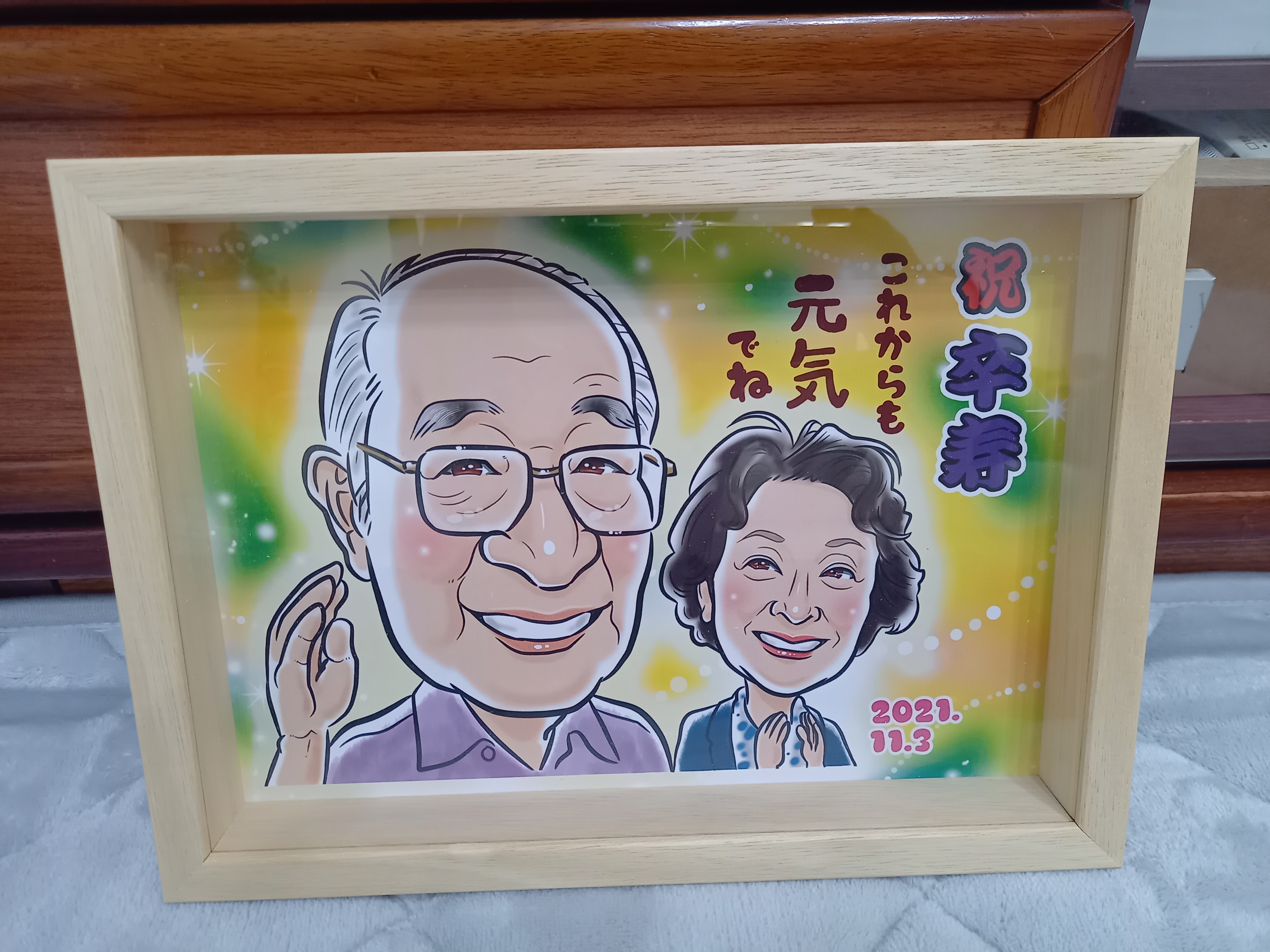 母親の喜寿のお祝いにプレゼントしました 両親の似顔絵を書いてもらい すごく特徴をとらえてくれていて そっくりだったので びっくりでした 背景も 思った以上にきれいで すごく良かったです 頼んでから すぐに 届いたのも びっくり 両親も こんなそっくりにと大喜びしてました
