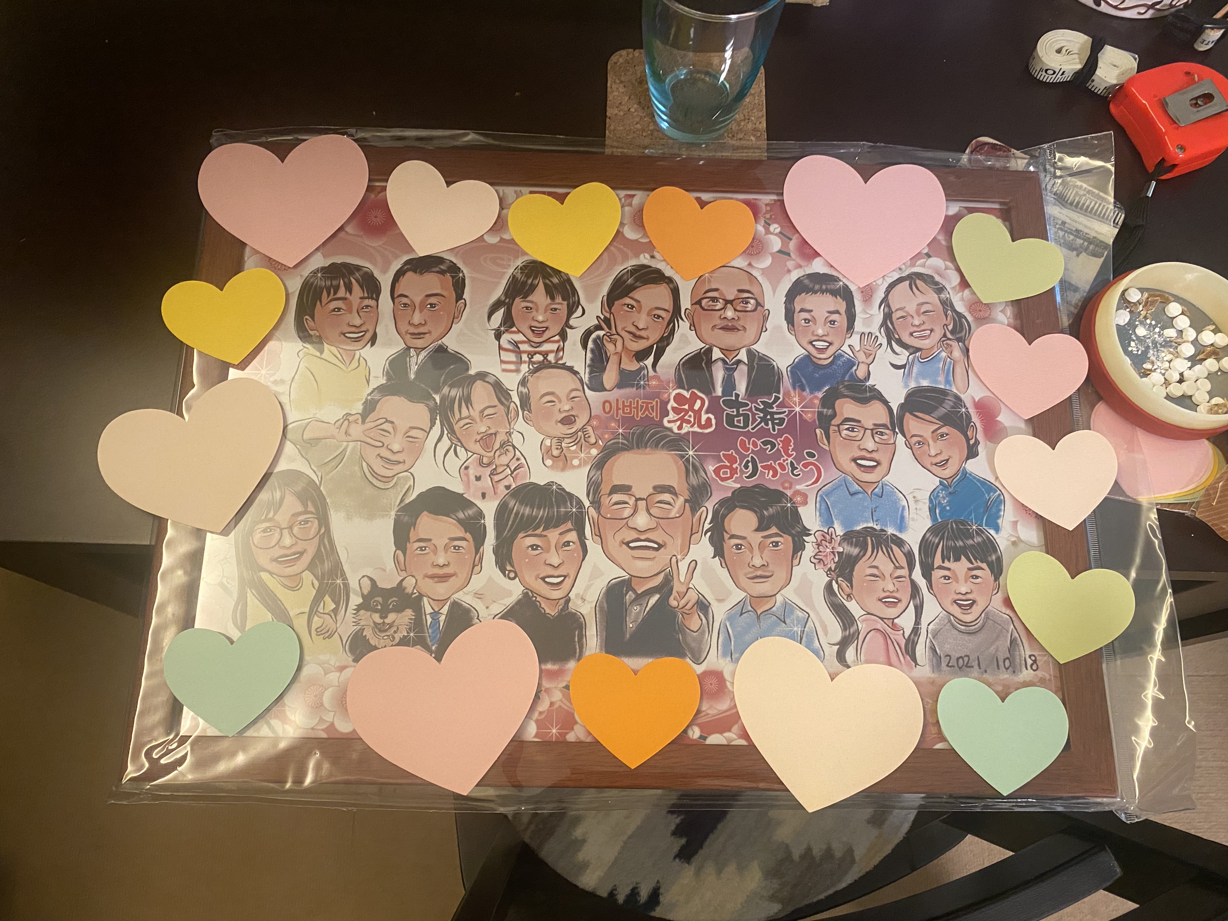 父の古希祝いに20人の似顔絵を描いてもらいました。 特徴をつかんでいながら可愛く仕上げてくれました! 特に子供達が可愛く描かれてた様な気がします。くしゃっと笑った笑顔がすごく似ていて、見てると思わず笑ってしまいます。 タイミングはあると思いますが、修正対応が早くて、1時間以内くらいに戻してくれました。少し手直しお願いしたのに予定日に発送してくれたのですごく助かりました。 メールでやり取りするのですが、レスが早くて、こちらが見落としていたら電話でも知らせてくれたので、やり取りがスムーズに進みとても良かったです。 思い出に残る一枚をありがとうございます。