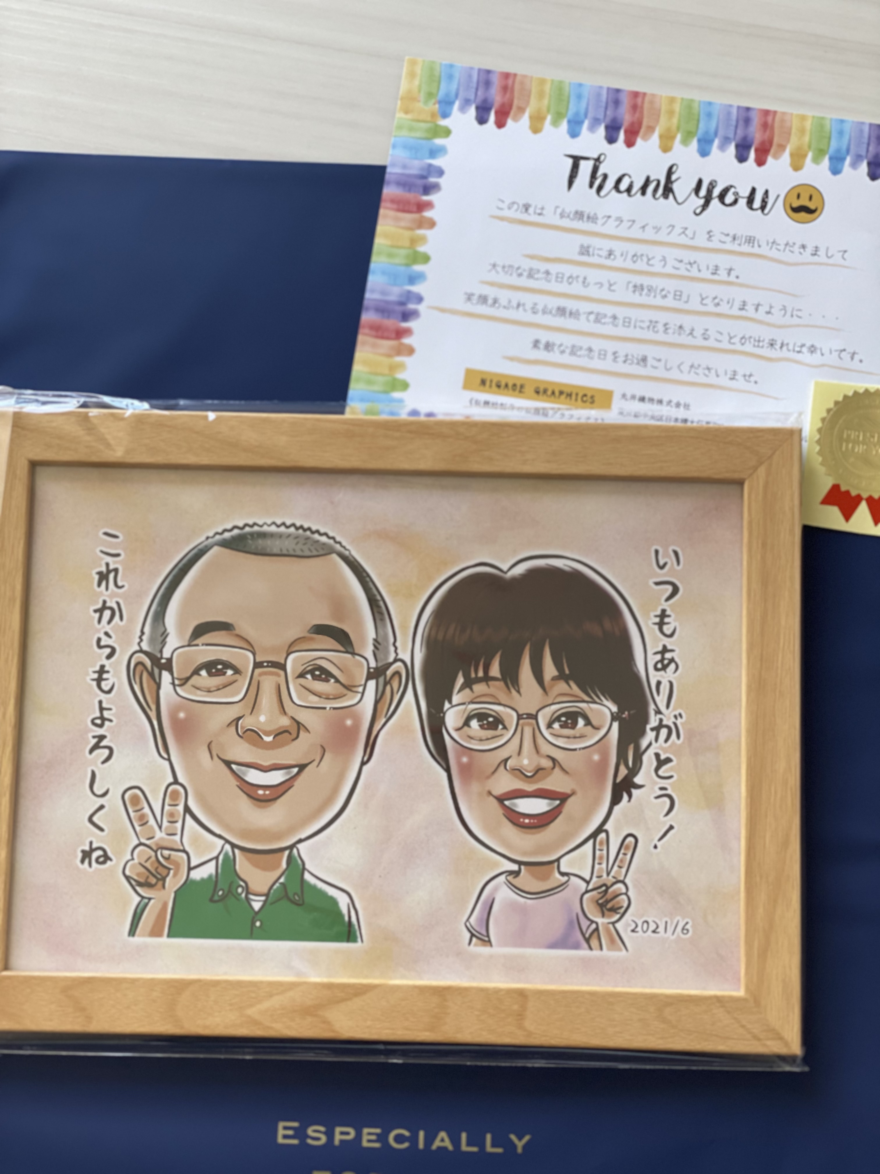 初めて利用しましたが、数枚の写真からこんなに似てて可愛らしいイラストが出来上がるなんて、やはりプロはすごいですね!お祝いじゃなくても、おうちに飾る用に家族のイラストもまたお願いしようと思います。あと発送予定日が予め表示されているので、とっても助かりました。早く両親に渡したいです。本当にありがとうございました!
