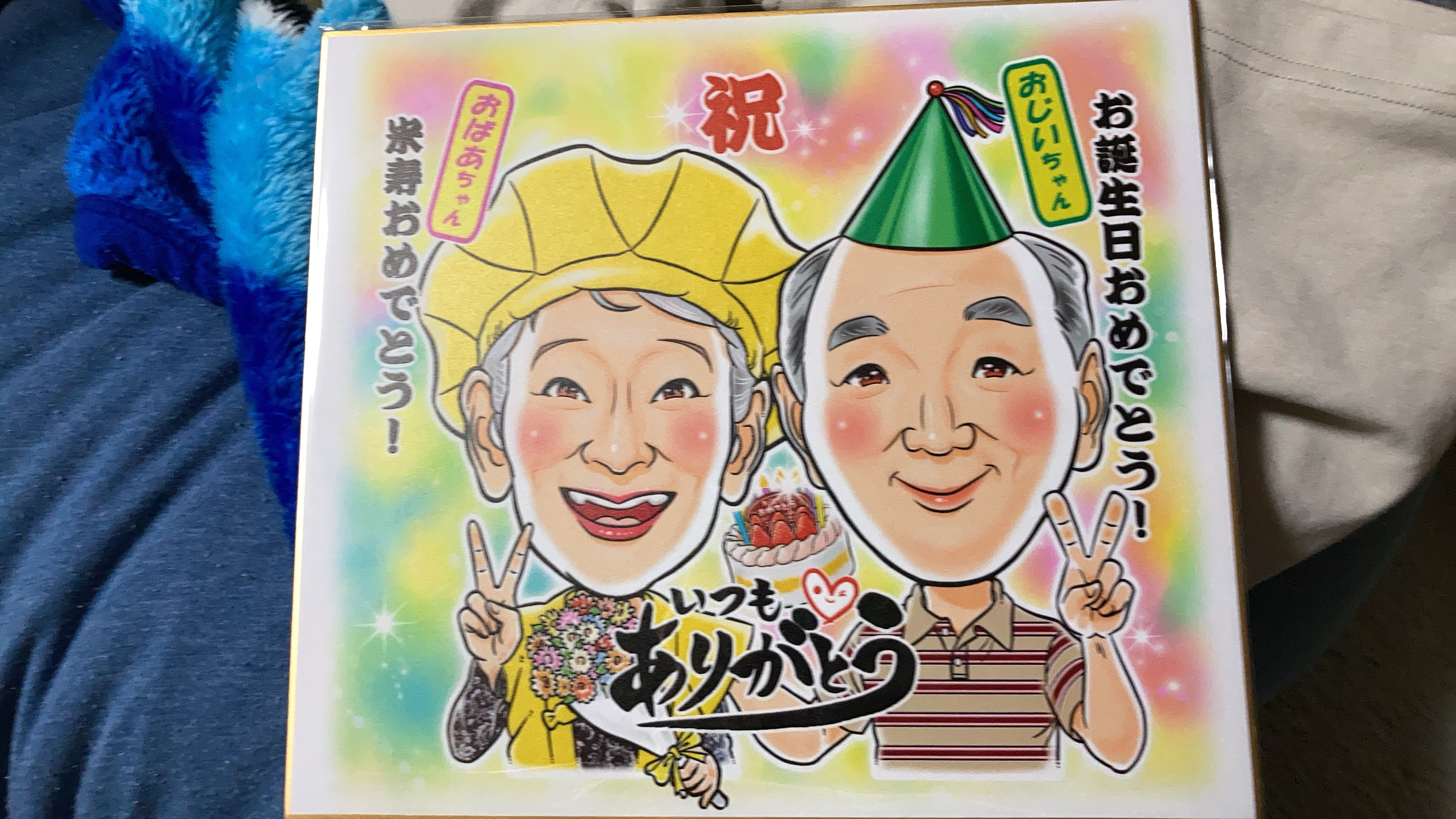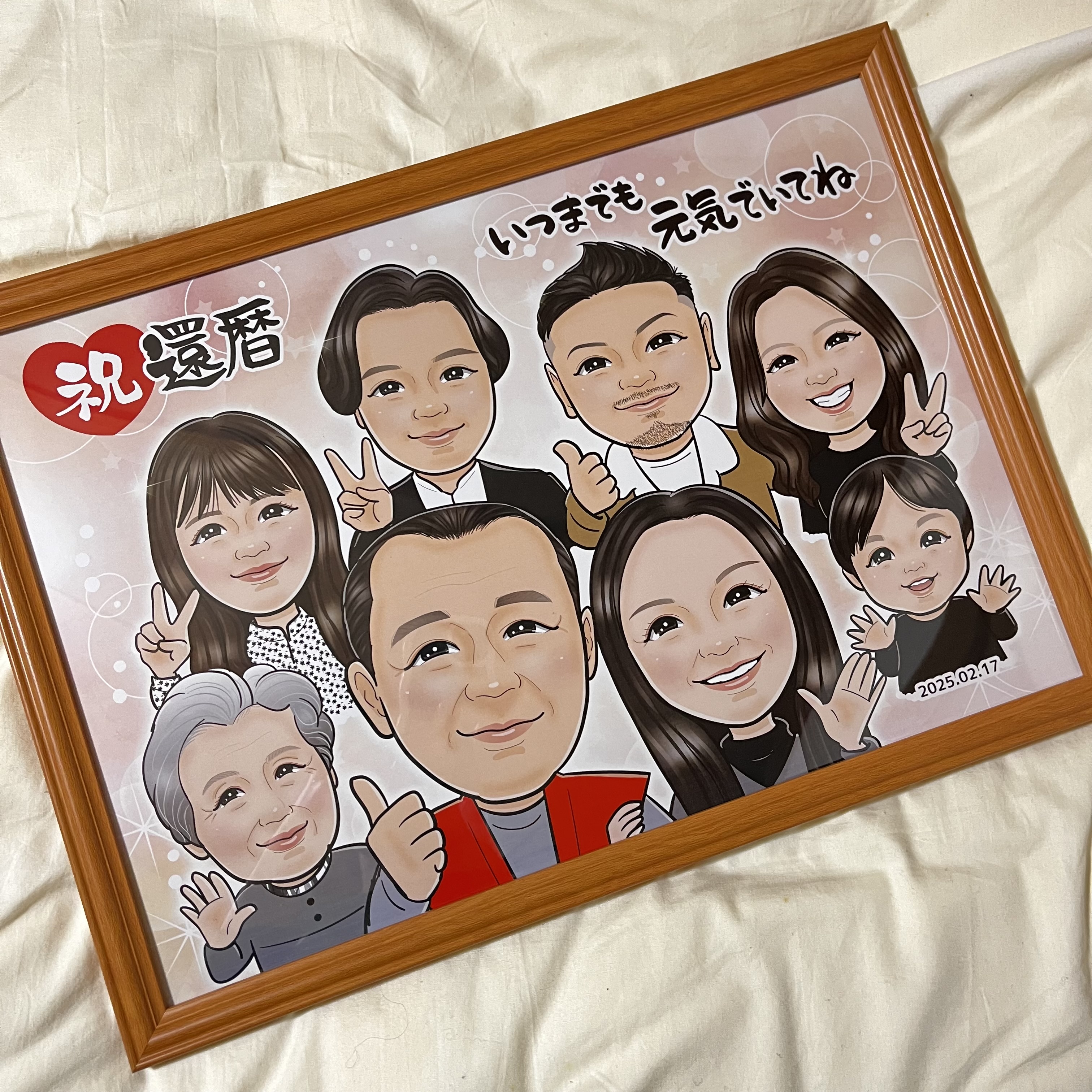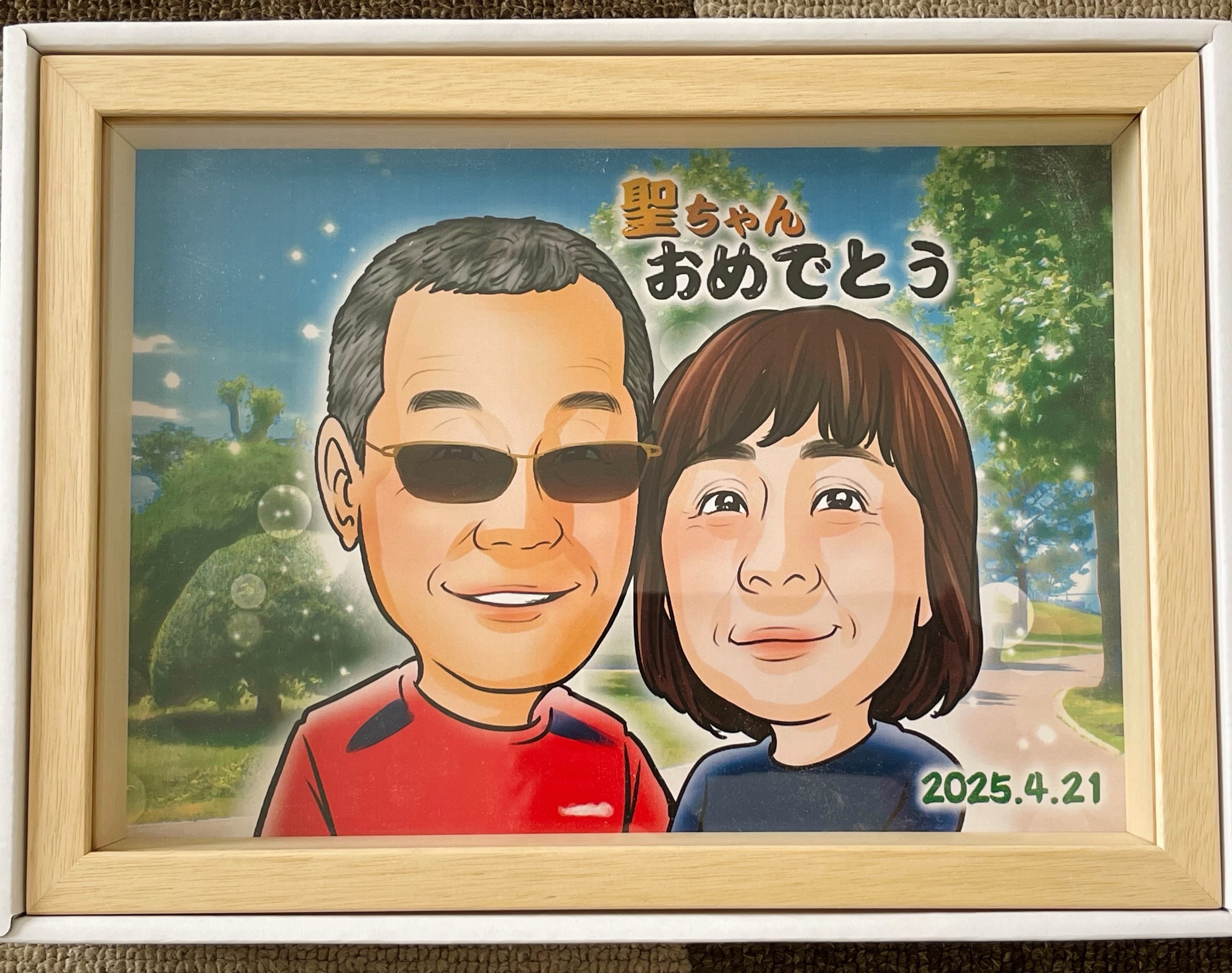 癌にかかり余命宣告されながらも頑張って迎えた誕生日のプレゼントに色々悩んでいたところ、友人から似顔絵なんてどう?との提案でオーダーしました。 届くまでは似顔絵だけじゃとかあれもつけようとか色々とまた悩んでいたのですが、届いて見た瞬間から涙が溢れてました。 とにかく素晴らしく写真とは違う温かみや人柄が伝わる感動した似顔絵でした! 最高のプレゼントだと確信し他は何もつけませんでした。 受け取った父も涙ぐんで喜んでもらえました。 心のこもった似顔絵をありがとうございました!