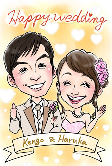 似顔絵グラフィックの似顔絵は、似ているだけというものではなく、お描きする二人の雰囲気、幸せそうな笑顔を想像し、絵で表現いたします。